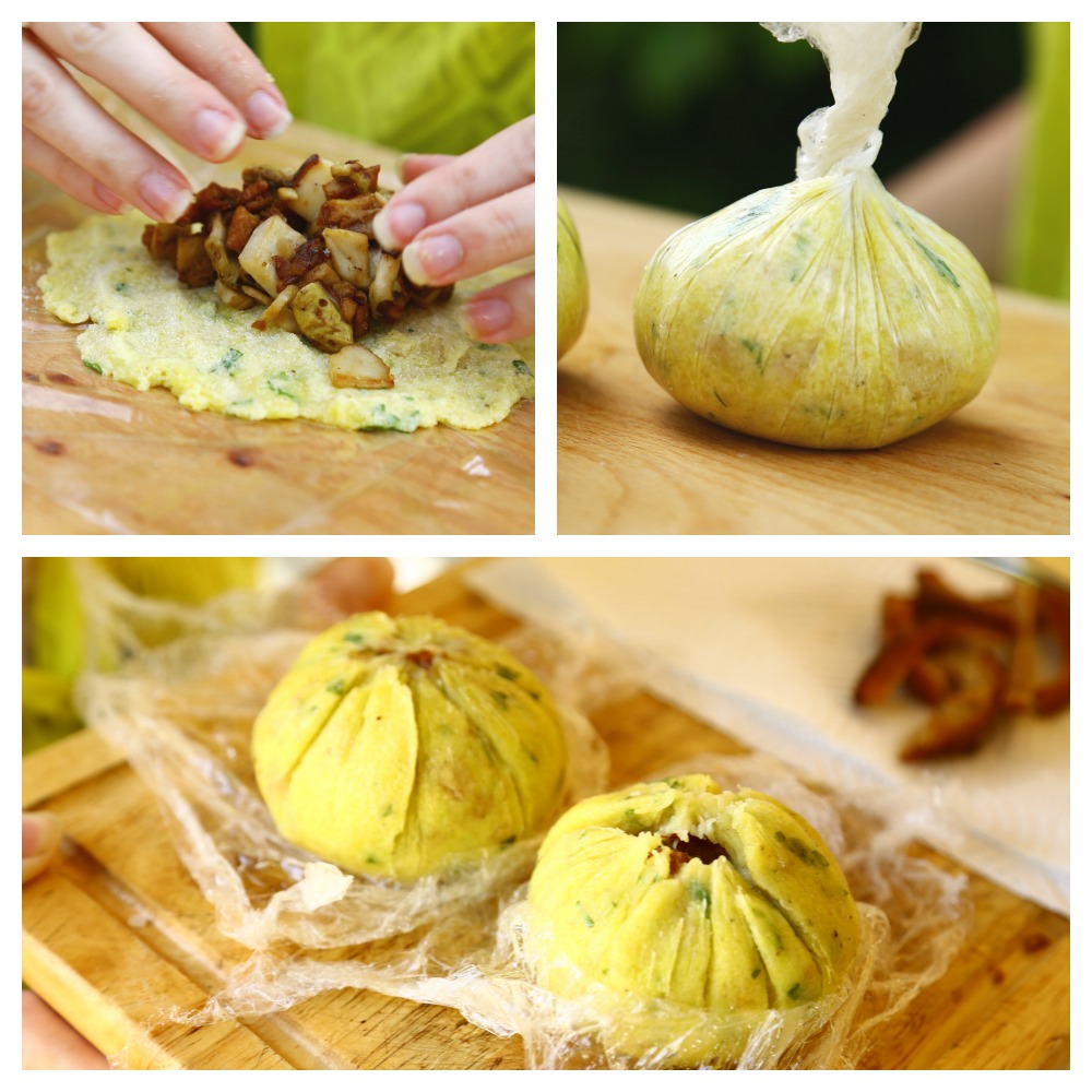 Na fólii dlouhé asi 50–60 cm uděláte dva knedlíky. Mažeme ji sádlem proto, aby se fólie na těsto nelepila a knedle aby měly lesklejší povrch. Na fólii rozdělte těsto na 4 díly a pomocí rukou a trochy mouky udělejte placičku. Střed představuje dolní stranu knedlíku, tam může být těsto tak 1 cm vysoké, ke stranám ale ubírejte do ztracena. Až se měšec spojí, bude těsto díky tomu rovnoměrně silné. Placička by měla mít v průměru řekněme 18 cm maximálně. K tomu stačí hrst nádivky (asi 3 vrchovaté lžíce), aby se vše podařilo dobře a pohodlně zabalit pomocí fólie kolem. Zakroutit, doupravit tvar a je to. Směřují do páry na 14 minut. Pak hned vybalte, propíchněte a jsou hotové.