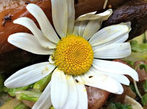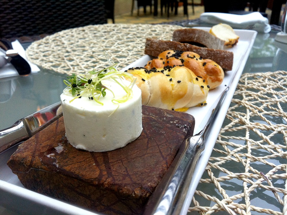 Já měla tu smůlu, že se v horním patře zámku konala nějaká slavnost se živou muzikou, která se třískala s Jamesem Bluntem (za 3-chodové menu jsme si jeho CD stihli vychutnat celé rovnou 2x za sebou :-D), znělo to jak nepovedený remix, hudba shora byla dost hlasitá a člověk z toho měl za chvilku velkou hlavu… Během tohohle DJ setu jsem stihla ochutnat následující menu za 390 Kč, osobně bych ho nazvala kytičkovým dnem: