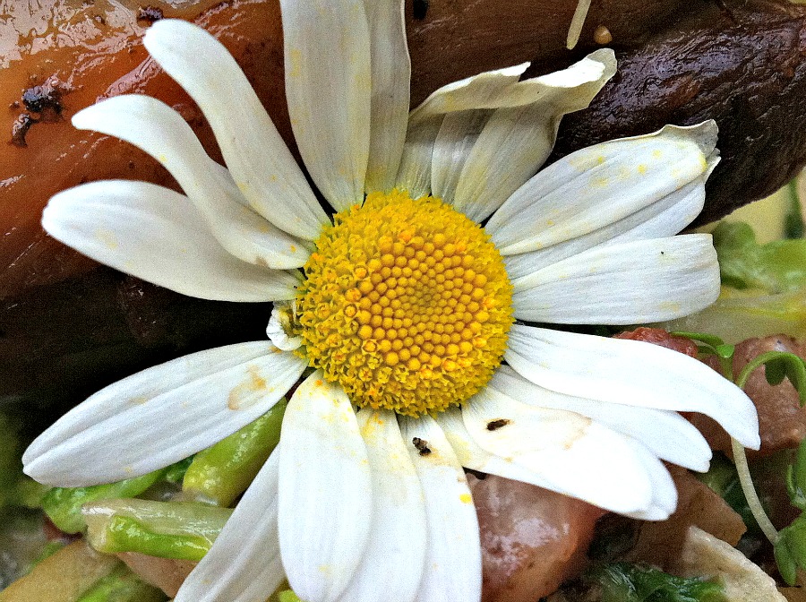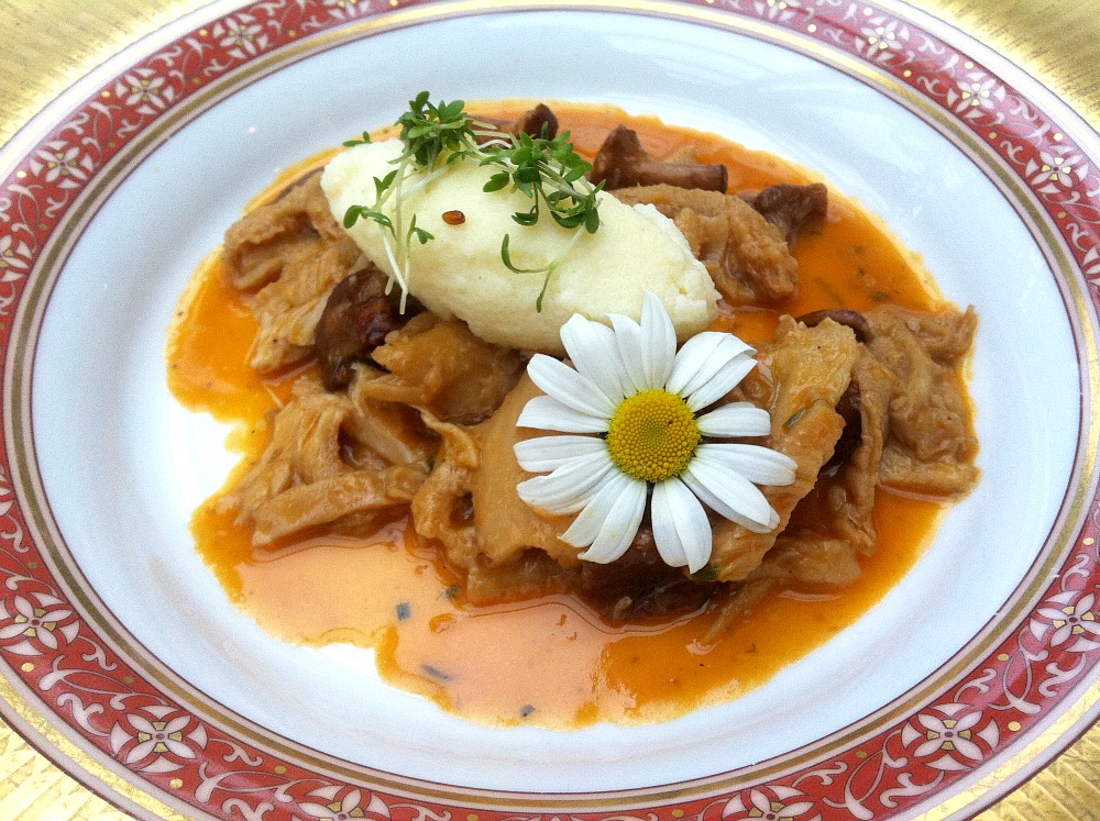 Předkrm: Tvarohový knedlíček podávaný s ragú z hovězích drštěk a čerstvých lišek. Naložené lišky z podzimu potřebují před novou sezonou spotřebovat a tohle je poměrně nápaditů způsob jak. Někteří teď ohrnujete nos, ale bylo to vážně dobré… Poslední dobou se na všech gastrofestivalech rozmáhá trend pojídání hmyzu a i tady, v Chateau, nechtěli zůstat pozadu – takže servírováno s kopretinou a minibroučkem.