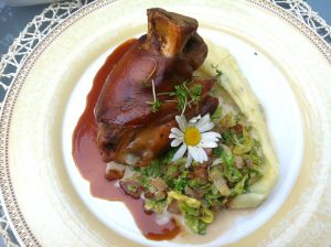 Hlavní chod: Pečené selečí kolínko se silnou šťávou, podávané s bramborovým pyré s jarní cibulkou, růžičkovou kapustou a s vypečeným špekem. Jeden minibrouček je na tříchodové menu přeci jen málo :))) No nic, stejně jsem ty kopretiny neměla v úmyslu jíst. Ukázkově zlatá a opečená kůže na kolínku, uvnitř šťavnaté, dobré pyré, silná demi-glace, křupavá jarní cibulka a opět příjemná změna v přílohách v podobě kapusty se slaninou a vypečenou kůží z jiného kolínka.