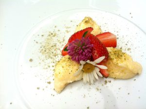 Dezert: Kukuřičné flameri s karamelizovaným mlékem, čerstvými jahodami a meduňkovým cukrem. Přiznávám, že flameri nebude do budoucna něco, co bych si záměrně objednala. Často se dělá také z dětské krupičky, z té už byl ale knedlíček k předkrmu, takže sem bylo nutno vymyslet něco trochu jiného… mě to ale připadalo jen jako lehce nasládlá polenta, takže flameri, tradičně kopretina a tentokrát navíc taky jetel zůstaly na talíři…jahoda ne :) Pro nafoušky dezertů na mazlavé bázi by to bylo ale asi i celkem mile jiné a zas něco nového.
