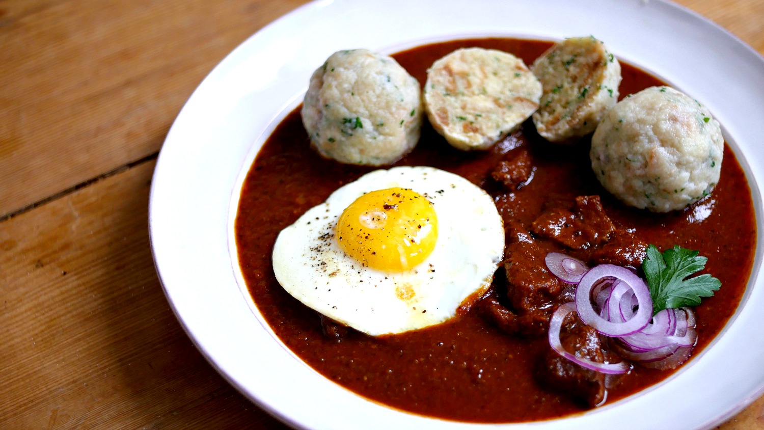 Po vzoru z restaurace jsem na guláš přidala sázené vejce. Prostě volské oko. Nejdůležitější je ho dělat zlehka a pomalu, na troše másla, které nechcete přepálit. Vajíčko se tak připravuje cca 5 minut. Pak ho osolte a opepřete. Pokud nemáte minipánvičku a toužíte po pravidelně kulatém výsledku, pomoci může lívanečník. Když není ten, tak velké kovové tvořítko na pyré, kterým kolečko vykrojíte. No a když ani to doma není, prostě proveďte obřízku :-D
