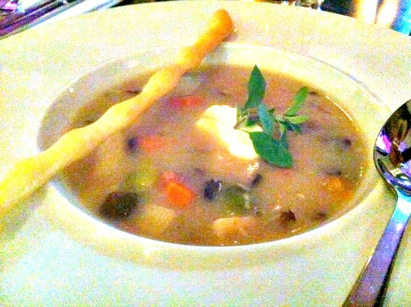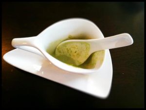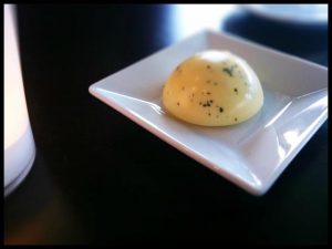 Malou pozorností podniku pro začátek neboli amuse bouche byla v den mé návštěvy polévka – chřestový krém. Chuti lahodné, bohužel však servírován v sice moderním a designovém, ale nepříliš praktickém šálku doplněném lžičkou tvarem typickou pro levné čínské bistro, a tak jeho konzumace místy vyžadovala gymnastické až akrobatické cviky a kreace. Samozřejmě pokud jste se nehodlali vzdát lžičky… já jsem nakonec polévku z hrníčku vypila. A bylo.