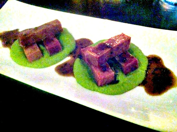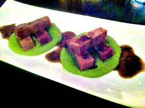Chuťově na tom byl lépe Lehce zauzený hovězí jazyk “Sous Vide”, s pyré ze zeleného hrášku a lanýžovou omáčkou 245,-Kč. Mnozí by řekli, že udělali z prdu kuličku. A měli by pravdu. Ultralevné suroviny v dané porci dali restauraci v nákladech jednomístnou sumu, takže celkem rejžunk. Pyré chutnalo spíš jako ze sušeného hrachu než ze zeleného hrášku, takže vlastně jako klasická hrachová kaše. Malinko přibarvená zeleným barvivem.
