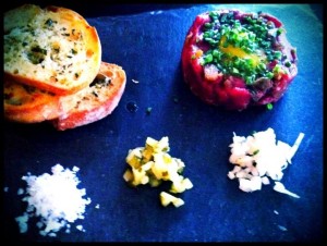 Ze studených předkrmů pak nikoho jistě neurazí hovězí tataráček s rozmarýnem a křepelčím vajíčkem (195,- Kč), tedy alespoň trochu netypická forma všem dobře známého pokrmu, který tu byl rozmarýnem opravdu velice příjemně ovoněný a i přes nadrobno nakrájenou kyselou okurku jako jednu z možných ingrediencí k přimíchání, která se mi zdá trochu dobrodružnou součástí věci, bylo vše ostatní v naprostém pořádku. Zajímavá byla i cibulka – ne čerstvě pokrájená, ale osmahlá.