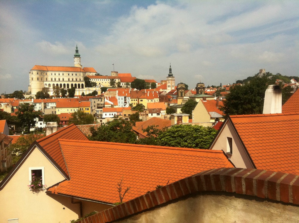 Už navečer druhého dne mého výletaření jsme po cestě do Tábora a neoslnivém zážitku v restauraci Goldie, ještě nemilejším zážitku v Bistrot de Papa v Počátcích, příjemném přespání v Hospodářském dvoře Bohuslavice u Telče, po velkých očích v Klobáskovém ráji a vegeobědě ve Znojmě (celý článek tady) dorazili do Mikulova. Kraj zaslíbený nás lákal nejen věží zámku tyčící se už z dáli nad viničním obzorem, ale také velmi zvláštně vyhlížející dopravní nehodou, kdy pán ve dvě hodiny odpoledne ukotvil svou oktávku na betonovém deklu za chodníkem v protisměru tak, že měla všechna kolečka ve vzduchu a odřela si bříško. Policajt to tam zrovna vyměřoval. Tohle zkrátka nevysvětlíte. Asi nezačnu úplně vesele, ale kolem silnic mezi okolními vesnicemi se to znepokojivě hemží křížky a svíčkami. Rovnou jsem měla jasno, že pokud na kolo, tak jedině někudy, kde auta nejezdí. O tom, jak jsem nakonec stejně na silnici na vypůjčeném kole vyjela a skoro umřela, v příštím článku. Mimochodem od minulé návštěvy jsem úplně zapomněla, jak na Moravě jezdí autem všichni pomalu (a stejně bourají). Další dny jsme jezdili už úplně stejně pomalu jako ostatní :-D