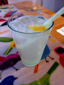 Někdy už bývám k těmto doporučením skeptická (a v Klentnici se následně ukázalo, že mám proč, ale to až v souvislosti s tím mým cyklovýletem později), ale je fakt, že není zas tak moc z čeho vybírat. Nuže bistro Sojka a spol. se nachází v prvním patře náměstního domu. V přízemí najdete obchod se vším, od kozích sýrů přes tofu po výběr čajů, takový, že se vám z toho hlava točí. Na chodníku měli ještě tři stoly coby zahrádku. Raný srpen nabízel více než vysoké teploty a přes den bylo v restauraci takové vedro, že jste se ještě večer při příchodu orosili. Přes otevřená okna je tu hic, že by člověk padnul. Přiznám, že tohle na mě jako hosta nikdy neudělá dobrý dojem, když je v podniku nezvykle vysoká nebo nízká teplota. Rezervaci jsem měla večer na sedmou a pořád si to žádalo okurkovou limonádu s ledem za 35 Kč. A záhy hned druhou. Ale byla skvělá! Trochu citronové šťávy, cukru, vymačkaná šťáva z okurky a dolito vodou. Tedy mým odhadem.