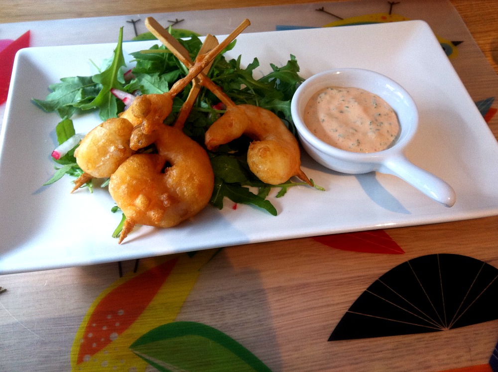 Jeden předkrm. Jedna polévka. Dvě hlavní jídla. Tak jsem pojala test. Krevety v tempuře s malým salátkem a pikantní omáčkou za 135 Kč. Schválně jsem se ptala předem: „Jsou ty krevety čerstvé, nebo mražené?” Samozřejmě v našich zeměpisných šířkách setkávajících se s našimi délkami to slovo čerstvé přeci jen dostává poněkud posměšný nádech, ale myslela jsem v rámci našich možností. Rozumíme si. Obsluhou potvrzena lepší varianta a ejhle – fakt že jo. Krevety rozhodně nebyly gumové, ale pěkně křupavé. Voněly. Salátek i mírně ochucený, salsa víc než mírně pálivá a čelo se rosilo ještě víc než při příchodu. Ale chutnalo.
