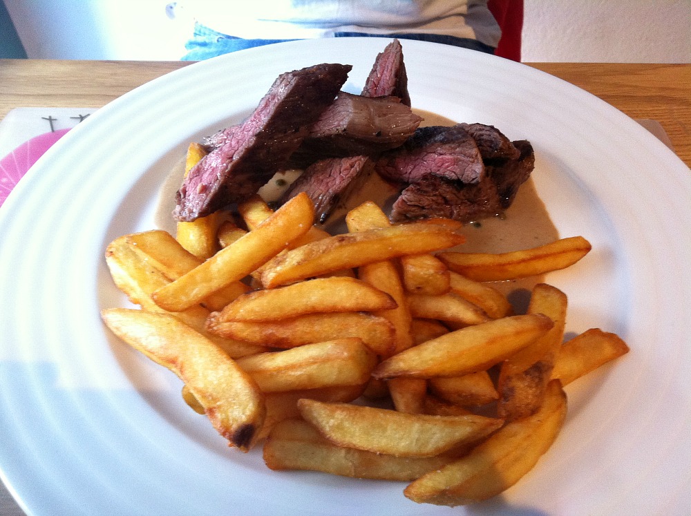 Flank steak a hranolky plus pepřová omáčka za 245 Kč. Kvalitní maso. Nemražené. Dobře podle požadavku propečené. Hranolky klasika, ale neurazila. Pepřovka s naloženým zeleným pepřem uspokojivá, však nijak oslnivá. Chybělo něco fresh k tomu. Talíř vypadá poněkud těžkopádně. Uvidíte z mých cest ještě lepší steak a z ještě lepšího masa. Takže neurazilo, ale ani nenadchlo či nepřekvapilo.