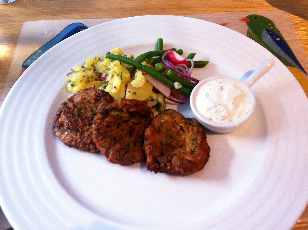 Cuketové karbanátky s vídeňským bramborovým salátem a malým salátkem za 125 Kč. Na ty jsem měla zálusk hned od začátku. Byly to takové klasické cuketové smaženky, ale skvěle k nim seděl odlehčující jogurtový dip. Jak vidíte rozložení na talíři, porce měla velikostní charakter spíše obědového menu. Hlavně toho salátku jsem objevila po delším zkoumání na talíři poněkud poskrovnu. Nic proti, ale větší strávník než já by se z toho moc nenajedl. Ale já jsem opak. Vzhledem k polévce a ochutnávkám před tím jsem si naopak nechala jeden karboš zabalit s sebou.