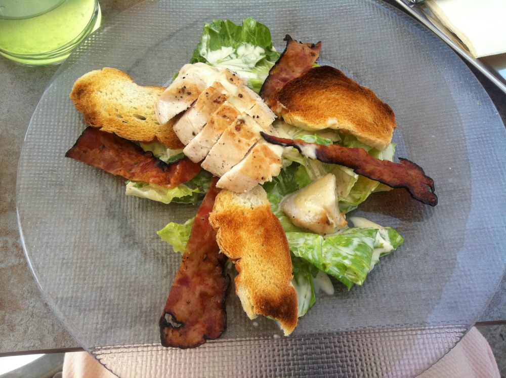 V rámci svých caesarovských testů, se kterými jsem začala výlet v Táboře, jsem nemohla slavný salát vynechat ani tady. Salát Caesar za 135 Kč. S dresinkem jsem byla o sto procent spokojenější než v Táboře. Spálenou bagetu jsem dala rovnou stranou. Kuřete až dost, radši bych víc salátu. Slanina mířila na kraj talíře k bagetkám. Prostě jsem chtěla jen římský salát, dostatek zvlhčovadla na každém lístečku a trochu parmezánu (byl tam, jen není vidět). Celkově jsem si ale pochutnala stále víc než v Goldie.