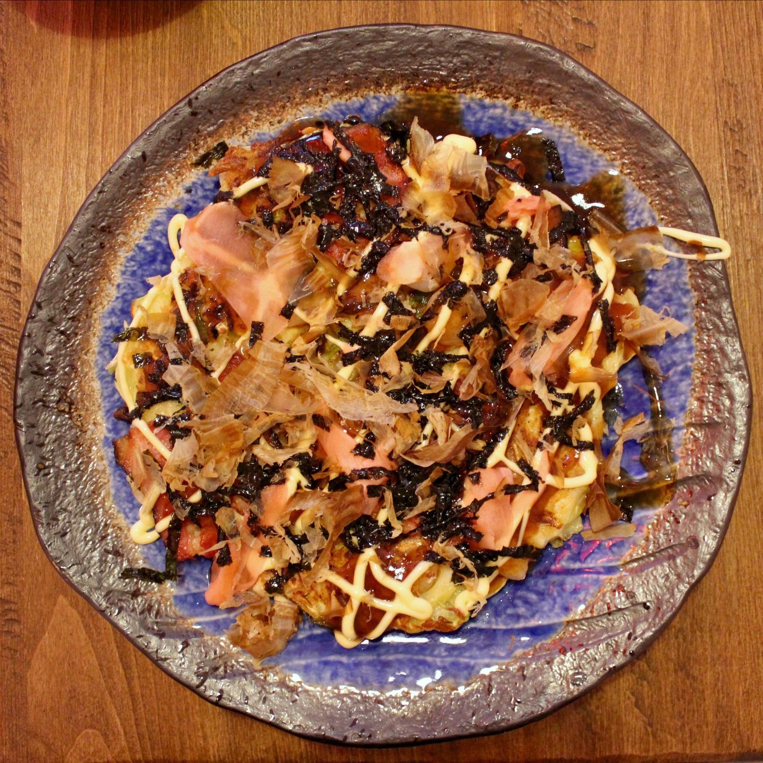 Oblíbená japonská zelná omeleta, kterou si hned tak nikde jinde nedáte. Mají i porci pro 2 osoby, ale na důstojné pojedení si stačí napůl dát i tu menší. Nicméně jako vyprošťovák ve východním stylu to funguje úžasně. Nepálí to. Ale je tam všechno, co potřebujete v sobotu, když se probudíte po bujaré friday night fever.