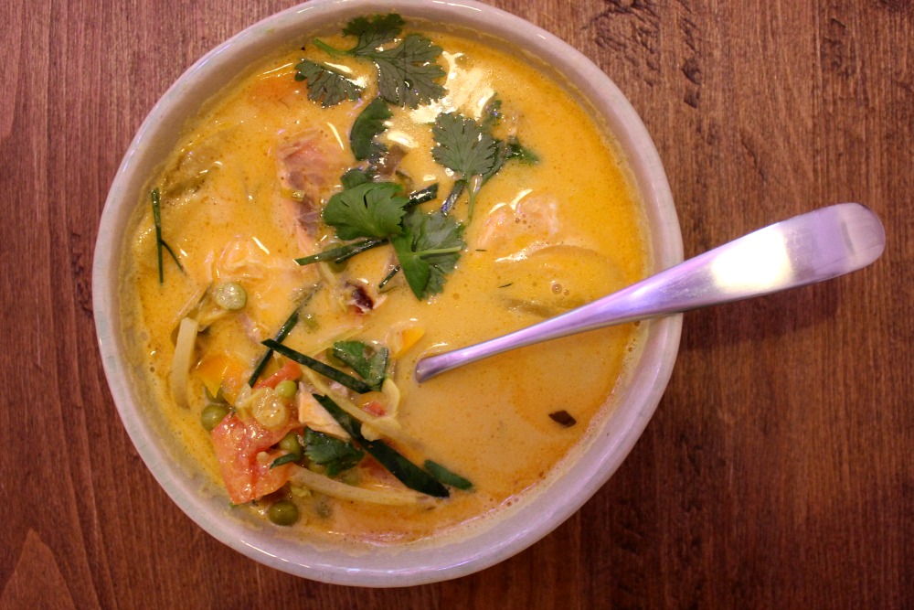 Prubla jsem i aktuální nabídku – tohle je variace na Tom Kha – nepálivá polévka s kokosovým mlékem a lososem. Taky jsem neměla nic proti. Mám-li hledat, zas ty horší rajčata a možná bych nabízela chilli papričku vedle k dodání. Polévky byla ale porce jako blázen. Miska i lžíce jsou fakt veliké.