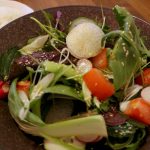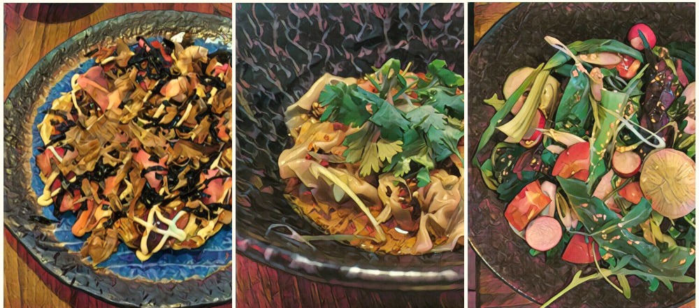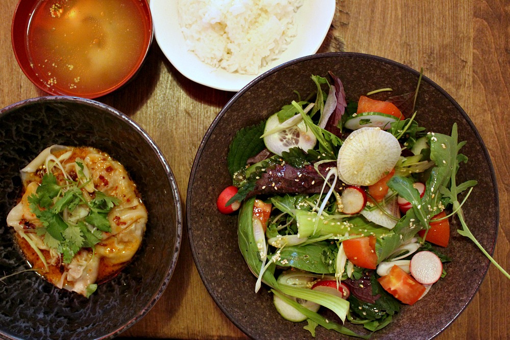 Cena je za celý tenhle paklík, takže za ty nové chutě se to opět vyplatí. Miso polévka mi tady hodně chutná, pasta s vývarem jsou příjemně nasládlé a jakoby jemné a hedvábné. Rýži čekejte spíše v japonském stylu – škrobovitější, lepkavější a více kulatou než třeba v thajských restaurací. Salát se k letnímu období bezvadně hodí. Byla v něm směs všeho možného – salátu pak choi, okurky, rukoly, ředkviček, ředkve a tuším i perily (asijská bylinka chutnající po skořici). Jedinou výtku mám k rajčatům. Pokud bych je sem vůbec dala, tak určitě něco zralejšího, voňavějšího a chutnějšího, bez tuhých středů. Rozhodně to vylepšil wafu dresing, který se nejčastěji dělá ze sojové omáčky, rýžového octa, japonské omáčky mirin a oleje.