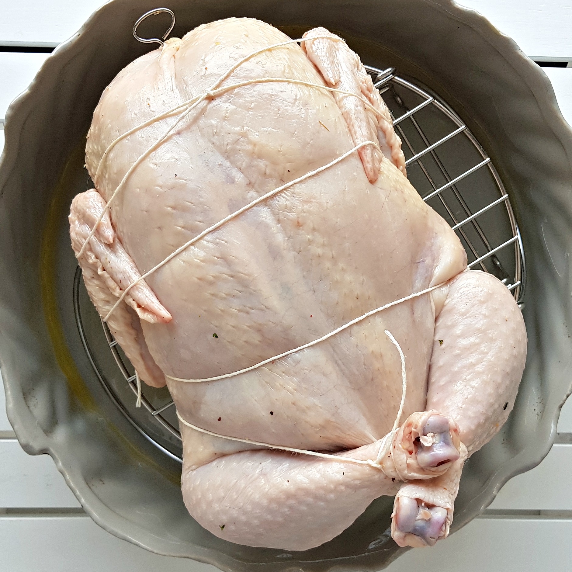 Pomocí kuchyňského provázku svažte nožky a obkružte i tělo, aby křídla neměla při pečení rozlet. Není to nezbytně nutné, ale výsledek bude pak vzhlednější. Jestli tvoříte klasickou roládu, je bondáž nezbytná, aby držela válečkový tvar.