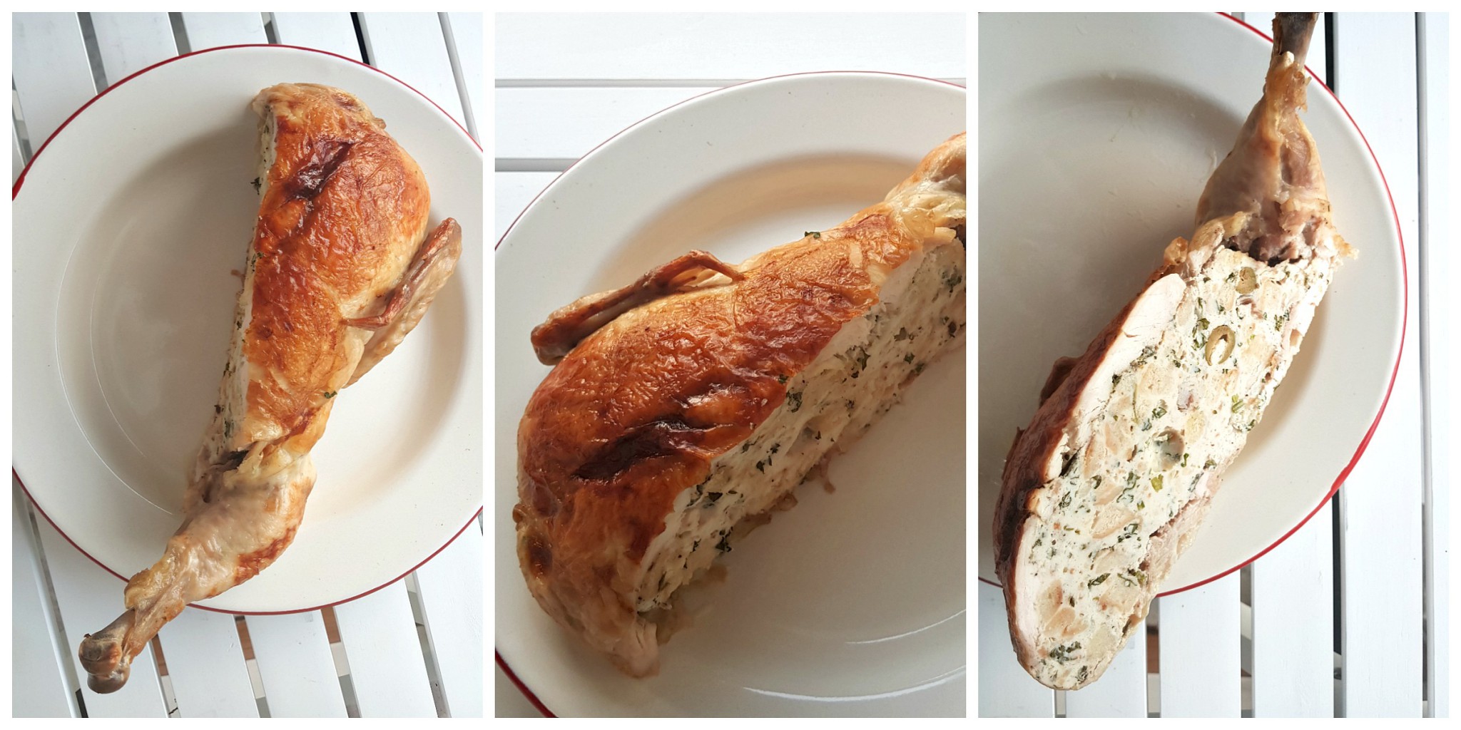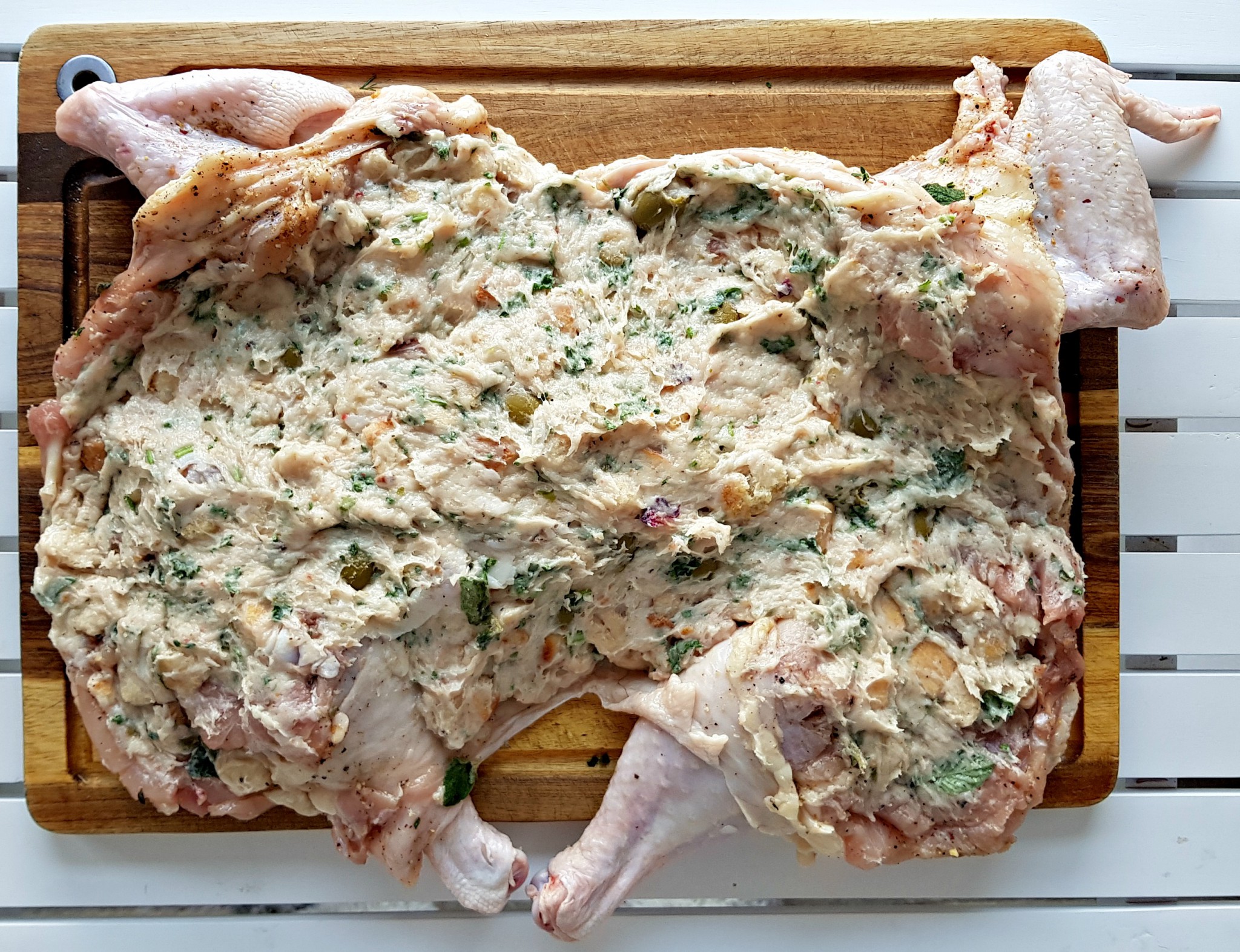 Když pak kuře jakkoli říznete, nikde nenajdete nic jiného, než perfektní mozaiku náplně. Vše bude kompaktně držet. Bude to úžasně šťavnaté. A jediné kostičky na ohlodání najdete v křídlech a jednu ve stehnech. Ideální.