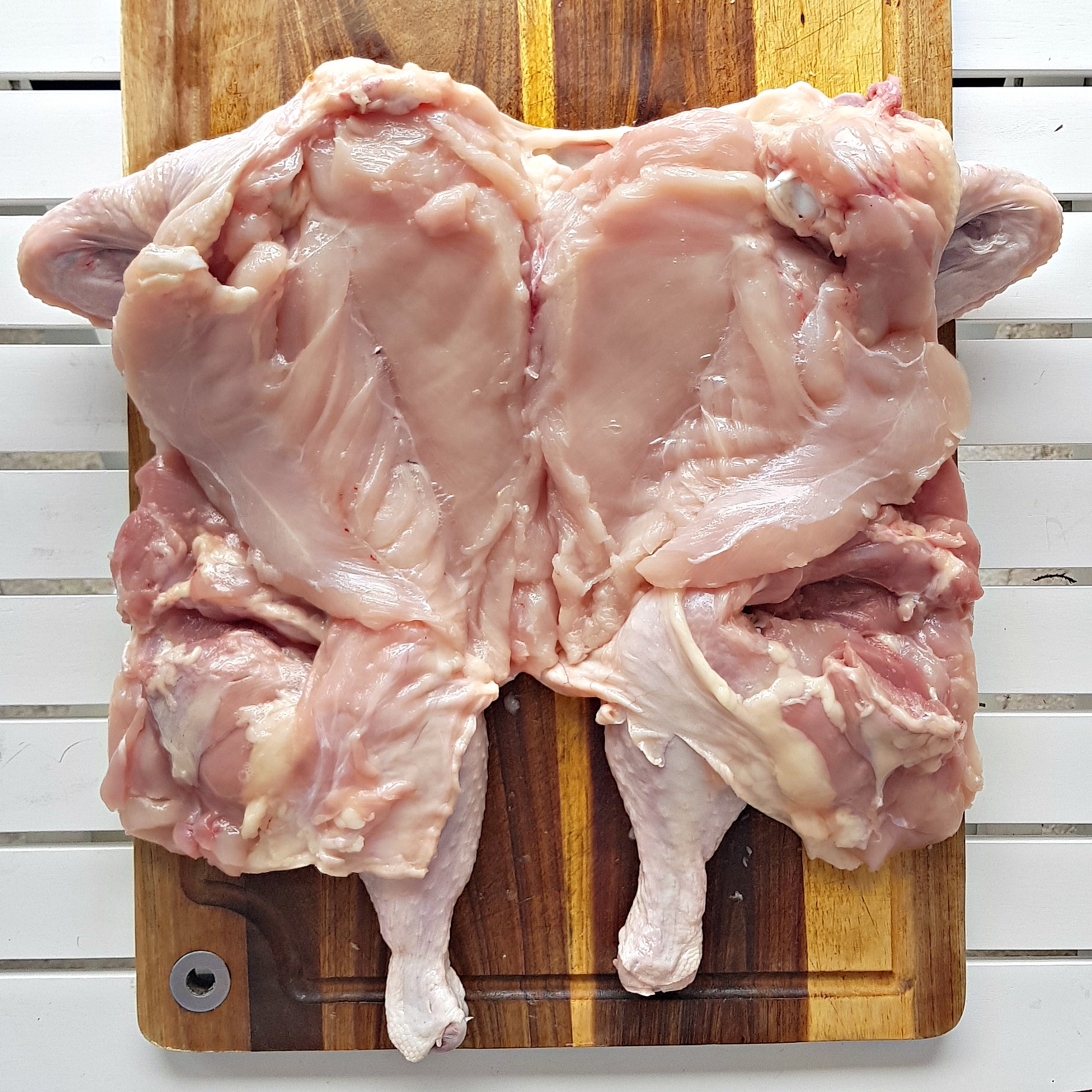 Musíte z něho dostat pryč skelet. Vypadá to jako nepřekonatelný úkol, ale nebojte se ničeho nic. Potřebujete vzrostlejší exemplář, abyste se nemuseli prát o každé deko masa a velmi ostrý nůž na vykosťování. Nicméně už jsem to zmákla i s křepelkou, takže nic není nemožné. Začít je potřeba na hřbetu. Sjíždějte po skeletu směrem k prsům. Abyste se dostali přes klouby ve stehnech i křídlech, musíte je prokřupnout (lépe řečeno vykloubit) a nožem se trefit mezi kosti. Bacha, ať neproříznete kůži mezi prsíčky při finišování, to by byla věčná škoda. A pak, když už jste opatlaní, radím vyjmout i horní kost ze stehen, aby zůstala jen ta poslední v paličce (dolním stehýnku). A takhle pak vypadá výsledek.