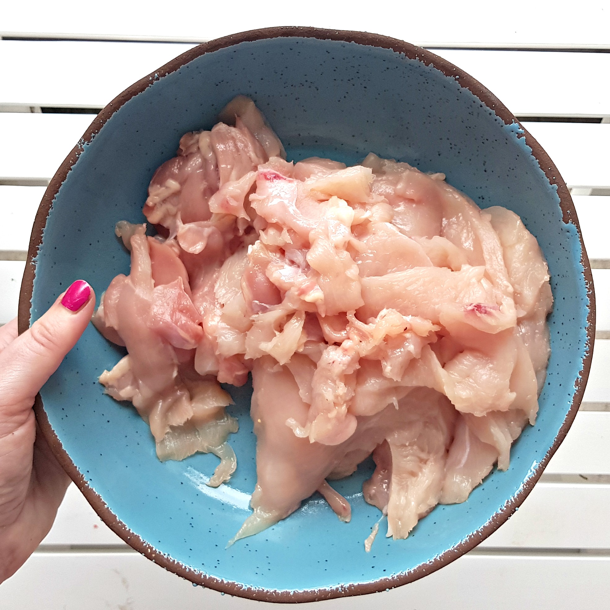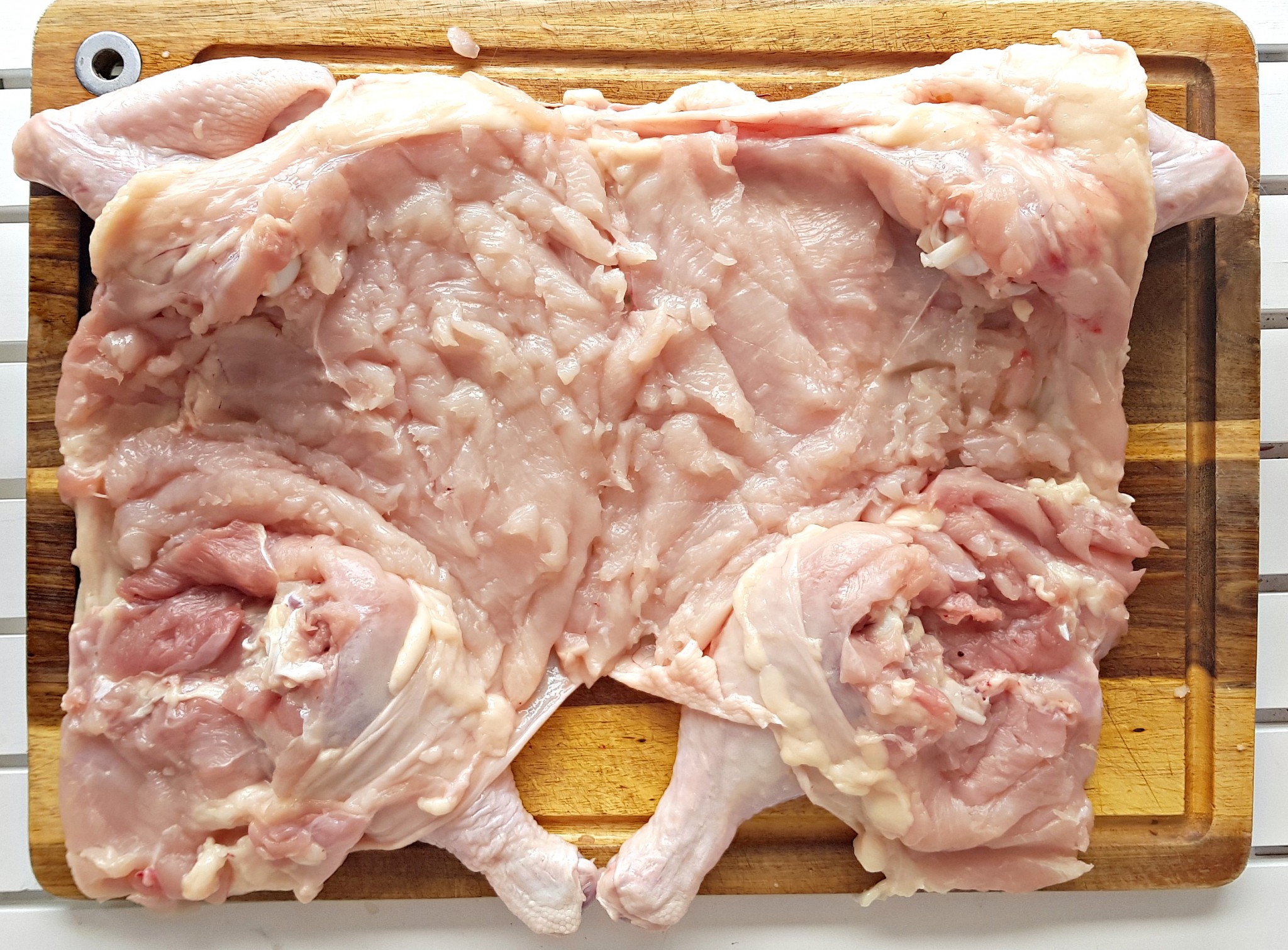 Na kuřecím „kabátku“ je teď ale příliš mnoho masa. Chce to jednolitou vrstvu do centimetru výšky. Hlavně na prsou budete v horní části hodně seřezávat. Něco půjde ale pryč i ze stehenní oblasti.