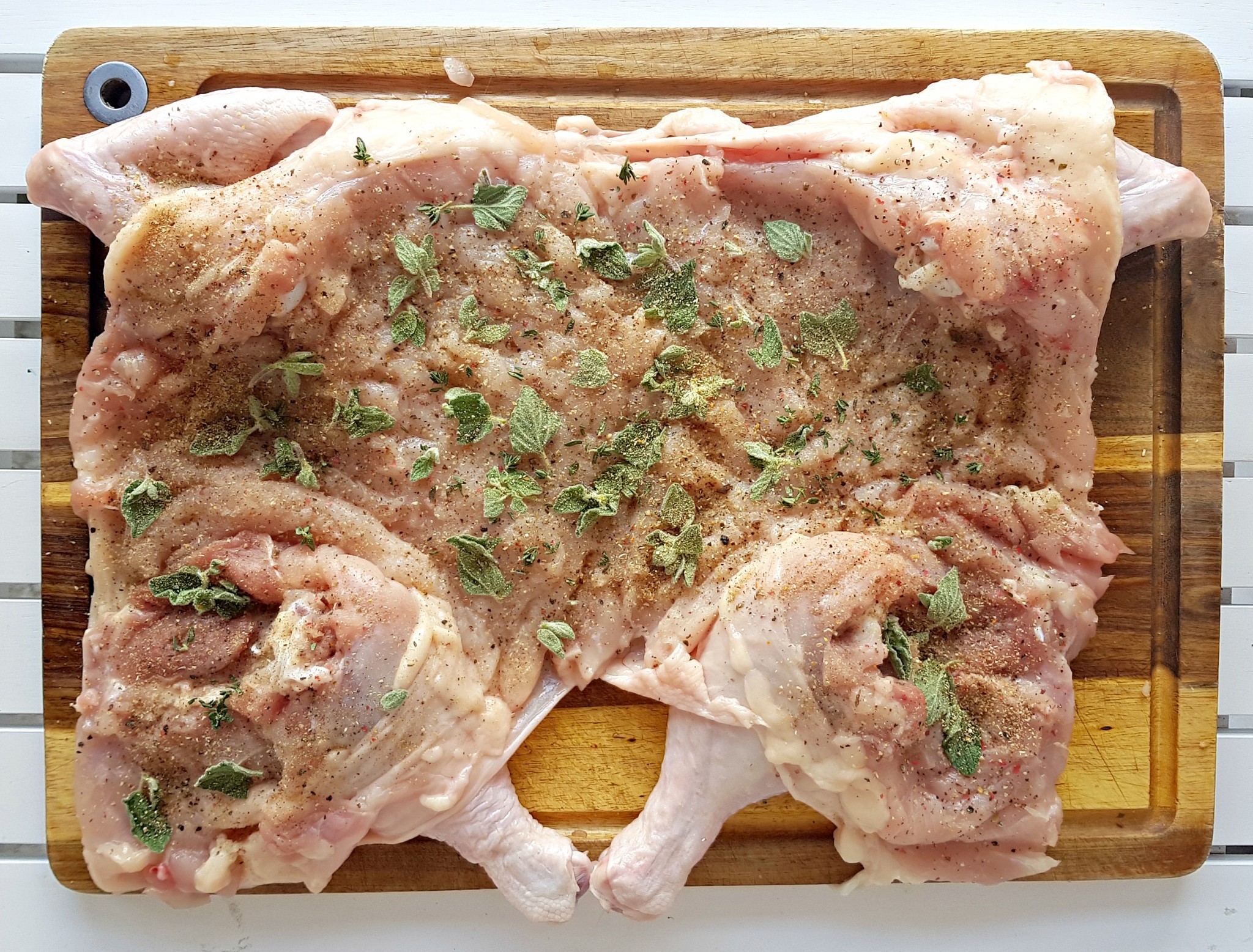 Nějaká ta drůbež během Velikonoc na talíř přiletět musí. Ať už to bude klasické kuře, obří kuře jako mám já ze Sklizeno (to na fotce má totiž 2,5 kg a v pohodě z něho připravíte 8 porcí), jarní kuřátko nebo třeba perlička. Zaprvé drůbež vyjměte z obalu a zvenku i ve vnitřní dutině osušte kuchyňskou papírovou utěrkou.