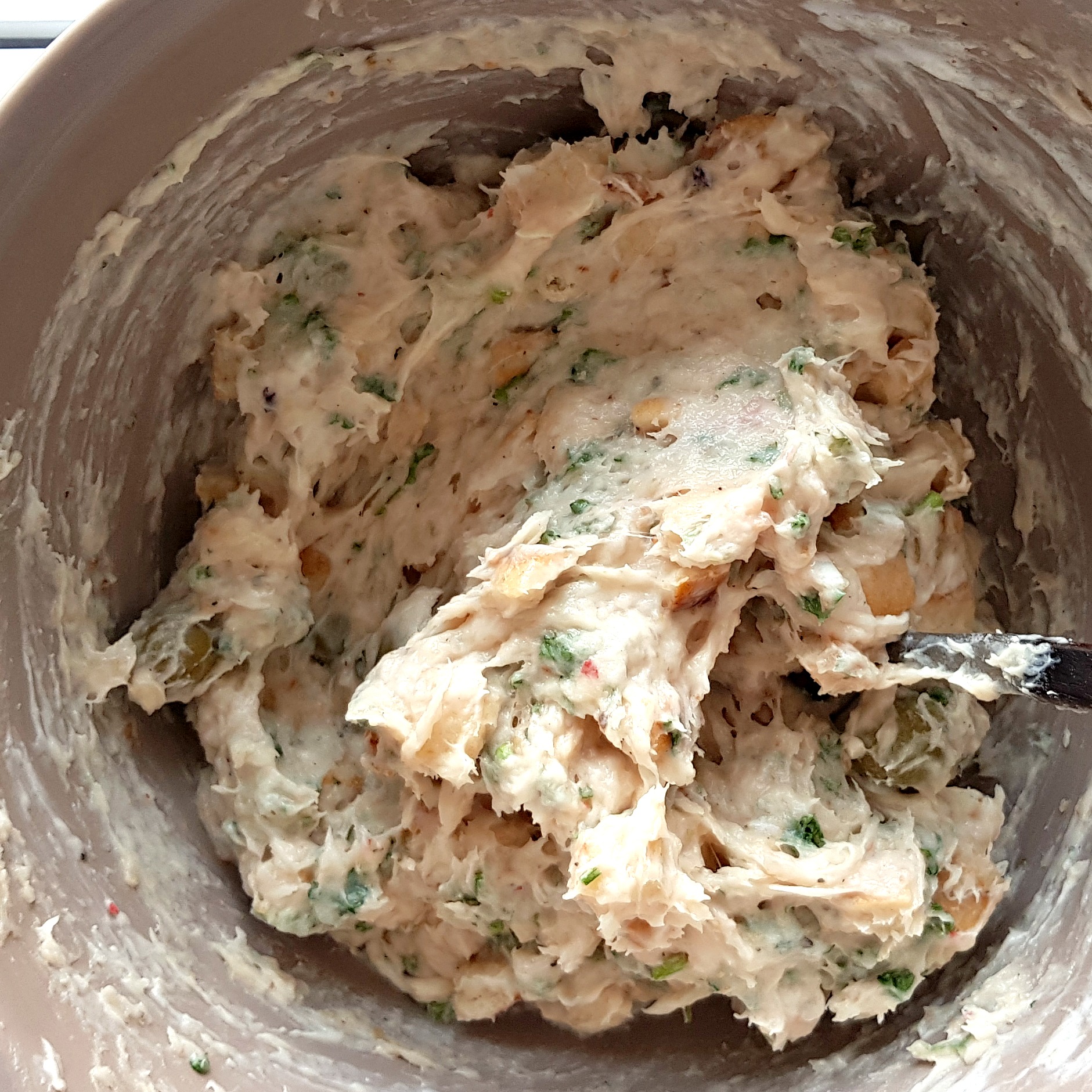Pokrájejte vše na menší kusy a spolu se šlehačkou, trochou soli a pepře promixujte na tekutější fáš. Na menší kuře do kila a půl budete potřebovat maximálně 150 ml šlehačky, na větší celý 200ml kelímek. Mixovat můžete v klasickém food procesoru a nebo pomocí pulzního programu v blenderu. Housky nakrájejte na menší kostičky jako na nádivku a nasucho je opečte na pánvi. Hlídejte, ať chrastí, ale nejsou spálené. Přimíchejte do fáše spolu s nasekanou petrželkou a trochu pokrájenými olivami a nechte 15 minut stát. Ve výsledku by to mělo vypadat takto.