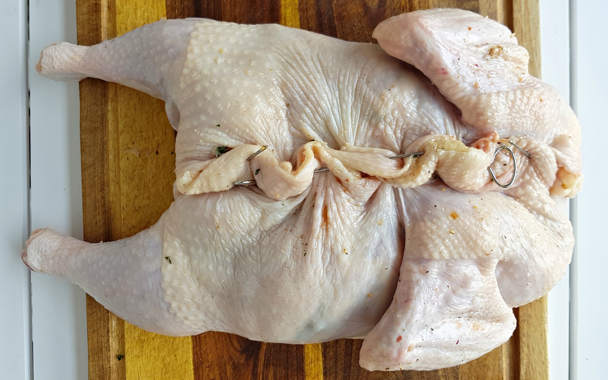 Zašijte nebo propiercingujte jehlami, aby všechno drželo v původním kuřecím tvaru. Propichujte kůži tak centimetr od kraje, protože se všechno bude později napínat a potřebujeme, aby držela.