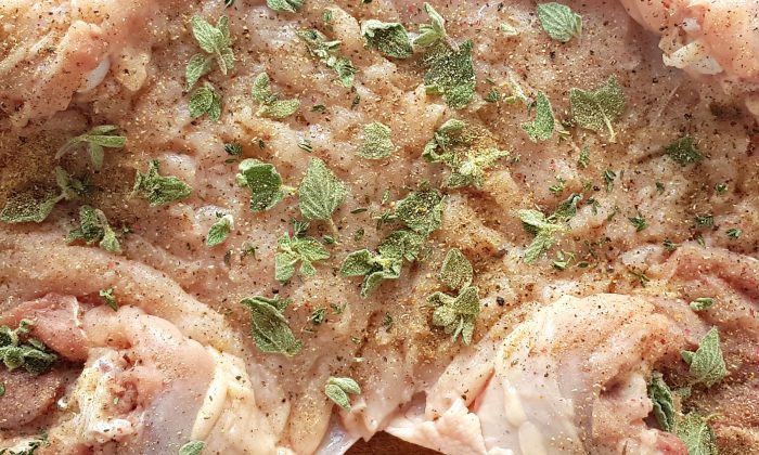 Během toho ochuťte kabátek solí, pepřem, mletými i čerstvými bylinkami. Použila jsem čerstvé oregano a sušený mletý rozmarýn.