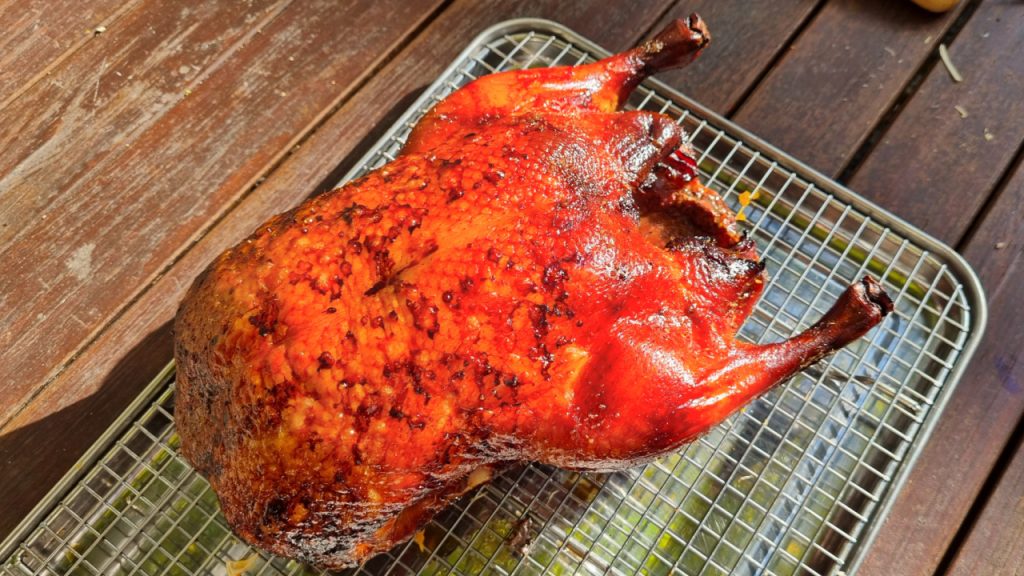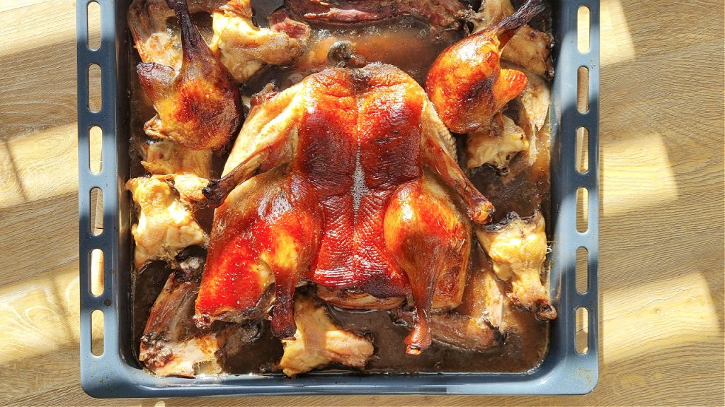 Když pečete celou drůbež, vždycky je vlastně nejdůležitější ten wow-efekt, když předvedete svůj výtvor strávníkům. Kůžička musí být zlatavo hnědá, ideálně nejen shora na prsou, ale všude a rovnoměrně. Nikde nic spáleného, popraskaného. Zkrátka akorát tak k nakousnutí. U kachny nebo husy, které mají velké množství podkožního tuku, si to žádá spoustu péče. V několika z následujících bodů jsem se nechala inspirovat přípravou kachny po pekingsku, byť styl pečení samotný je jiný. My na Svatého Martina nebo na Štěpána chceme, aby šla kost ze stehýnka vyjmout pryč bez jakékoli síly, aby maso odpadalo od kosti. V Asii kachny pečou zprudka a následně z nich odkrajují obřími rovnými noži často přesně 108 tenounkých plátků – maso je šťavnaté, místy malinko růžové, dost ho zbyde na skeletu. Nicméně nic nemá tak dokonalou kůži jako správně připravená pekingská kachna, takže tuhle péči si vypůjčíme.