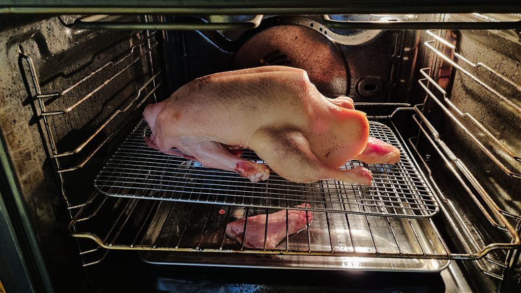 Pokud se má kůže péct rovnoměrně, je potřeba, aby prsa po celé své délce byla co nejvíc vodorovně. Druběž můžete na mřížce podložit odřízlými letkami, tím se vyvýší na správnou polohu, případně i čachrovat mřížkou samotnou. Nejpraktičtější by bylo ve finále i otáčet v troubě celou kachnou nebo husou, ale všude kape tuk, všechno pálí, dělá se to špatně. Pekingská kachna během pečení visí v peci, peče se tedy ve svislé poloze, to si v domácí troubě bohužel nedovolíme napodobit. Každopádně měla by mít možnost se opékat i vespod – to jí umožníte tím, že samotnou drůbež umístíte do výškově doprostřed trouby a na dno dáte pekáč s trochou vody (a případně třeba i s ořezem, droby, nebo třeba kuřecími krky či hřbety, abyste zesílili omáčku), kam všechno bude odkapávat. Vzduch musí proudit.