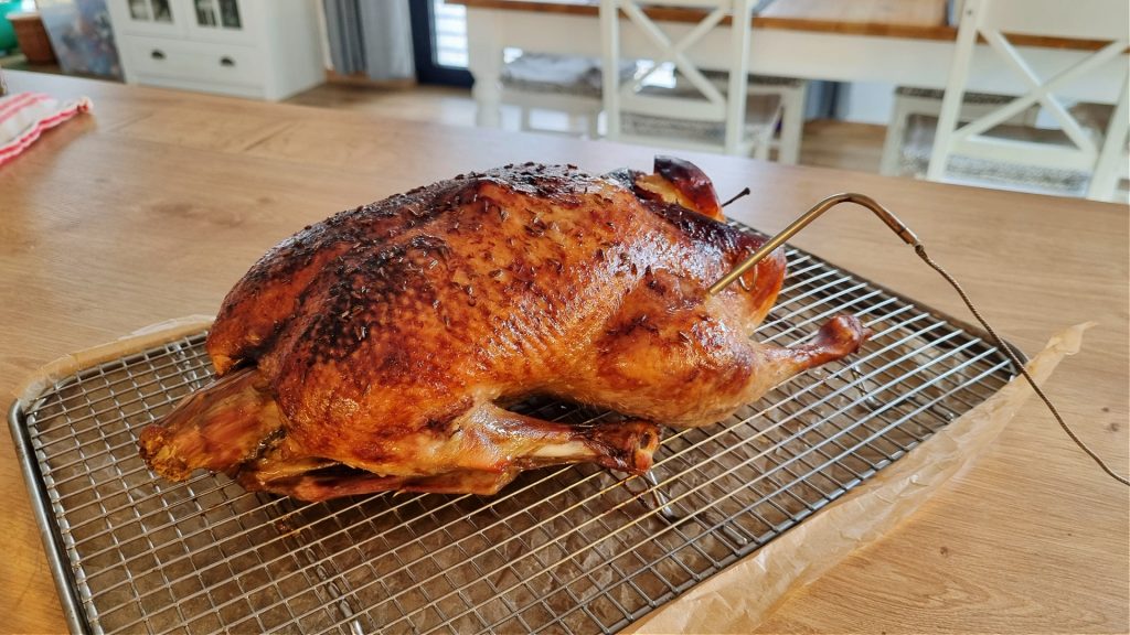 Pak můžete vše dokončit buď zase v troubě a nebo v případě skromnějšího počtu strávníků také v horkovzdušné fritéze. V první fázi prohřívat někde kolem 125 °C (v troubě to zabere třeba i půl hodiny, v horkovzdušné fritéze bude stačit maximálně poloviční doba. Pak přitvrdíte a horkým vzduchem ladíte barvu kůže k dokonalosti při 180-200 °C. Je potřeba to opravdu hlídat, pak je to jen o minutách. Hned, jak je to krásné, šup s tím ven, ať se maso nevysušuje.