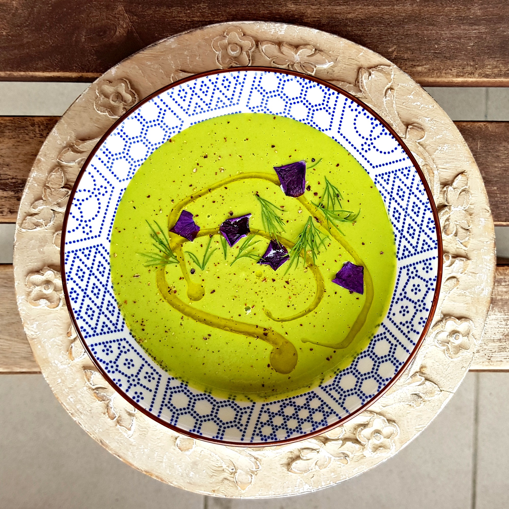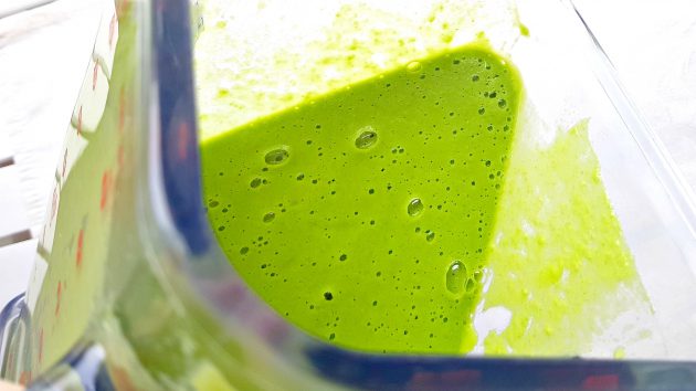 Rozmrazený hrášek se totiž dá mixovat prakticky ihned. Když polévku zpracujeme (doporučuju výkonný blender, který používám už několik let a viděli jste ho i v mých videích, tento od Sage) zastudena a krátce ji provaříme až těsně před servírováním, hrášek prostě nestihne zežloutnout. Na tento postup používejte buď čerstvě otevřený vychlazený kupovaný vývar a nebo právě uvařený (či převařený) domácí a co nejrychleji zchlazený (v zimě to jde přirozeně nejlépe venku na balkoně nebo parapetu).
