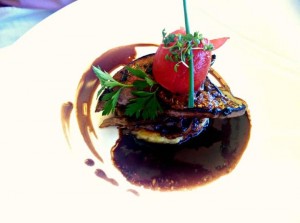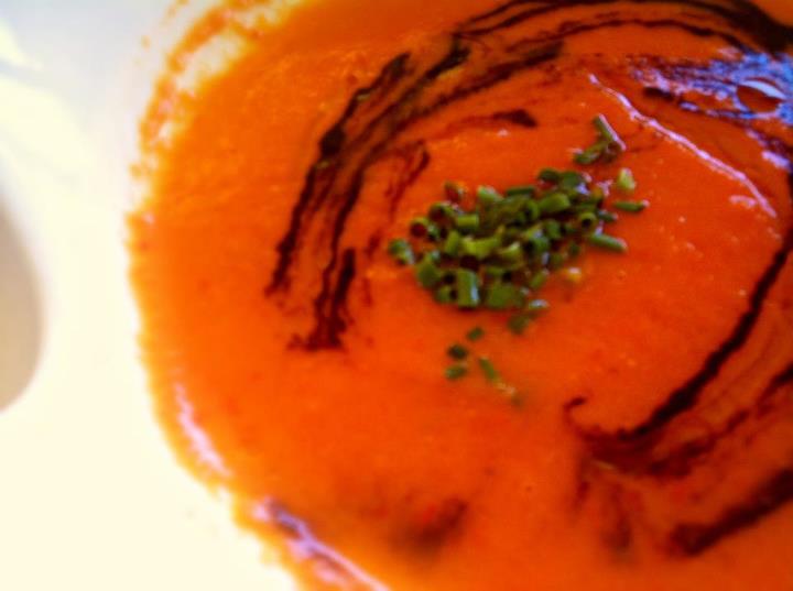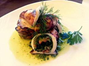 Naštěstí pocit vítězství jsem měla i já, a to po okouknutí přinesených pokrmů. To velmi oranžové, to je Krémová polévka z barevných paprik, s balsamicovou redukcí a červeným olejem za 65 Kč. Skvělá záležitost. Vzhledem k ročnímu období jsem ji tak trochu očekávala studenou, ale teplá byla skvělá. Nemůžu nic vytknout. Akorát sladkokyselá. K tomu balsamiková redukce a pažitka. Cena, myslím, obstojná. Dále tu máme Restovaná telecí játra na karamelové šalotce, podávaná s bramborovými plackami a rajčetem plněným řapíkatým celerem za 195 Kč. Kdo rád játra, byl by nadšen. Karamalová šalotka skvělá, šťáva k játrům taktéž, pěkně naservírováno, zajímavá příloha… A pak přichází Grilované čerstvé kalamáry plněné špenátem, lisovanou slaninou a parmazánem, rukolové pesto a lilkový nákyp za 255 Kč. Velmi férová cena. Sama jsem je vařila v následujícím VIDEOreceptu a náklady mi vyšly na porci kolem 80 Kč. Čerstvý špenát, opět nápaditá příloha…Jeden kalamár chtěl o minutku víc zůstat v troubě nebo v salamandru, ve špičce nebyl stoprocentně hotový, ale to byla opravdu jen špičička. Jinak porce obstojná, opět to na talíři vypadalo skvěle. Suma sumárum oceňuji originalitu místních pokrmů i foodstylingu v poměru k ceně a kvalitě surovin můžu doporučit.