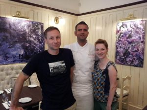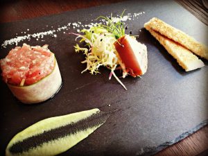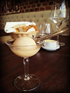 Na jídelním lístku najdete speciality z francouzské i české kuchyně, nejoblíbenější přílohou pana Kašpárka jsou jednoznačně nejrůznější pyré a nejčastější metodou je pomalé vaření ve vakuu sous-vide a to od hovězího jazyka až po pražmu. Obojí jsem taky ochutnala, ale pojďme popořadě. Tříchodové degustační menu tu stojí 650 Kč a pozor: šestichodové 850 Kč. Velikost porcí je počtu chodů přizpůsobená tak, aby jste nebyli přejezení už v polovině, ale doporučuju si ty dvě stovky připlatit a ochutnat toho co nejvíc. V mém případě přišla na řadu jako první Terina z Foie gras s jablkovo-křenovou pěnou, domácí brioška. Dekorováno malinami a hráškovým klíčkem. Příznivci světlých, tučných jater budou mlaskat blahem, všechny chutě vyváženy a foodstyling bomba. Pak Tuňákový tatarák s fenyklovým salátem, plátek tuňáka v sezamu. Zase skvělý talíř, tuňák voňavý, ten v sezamu byl lehce namarinovaný také v sojové omáčce a byl božský. Následoval Domácí hruškový sorbet se sektem. Pokud považujete sorbety za zbytečnou výplň degustačních menu, tak to to jen proto, že jste měli vodnaté tříště místo takto vyrobeného skvostu. Lahodná, smetanová chuť úžasné struktury. A sekt já ráda vždy a všude.
