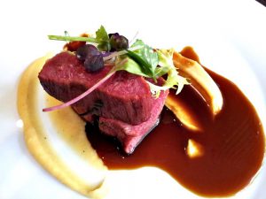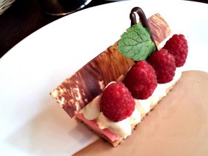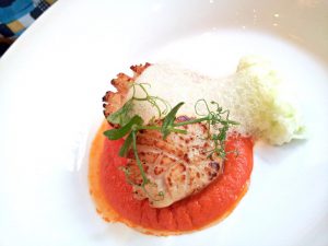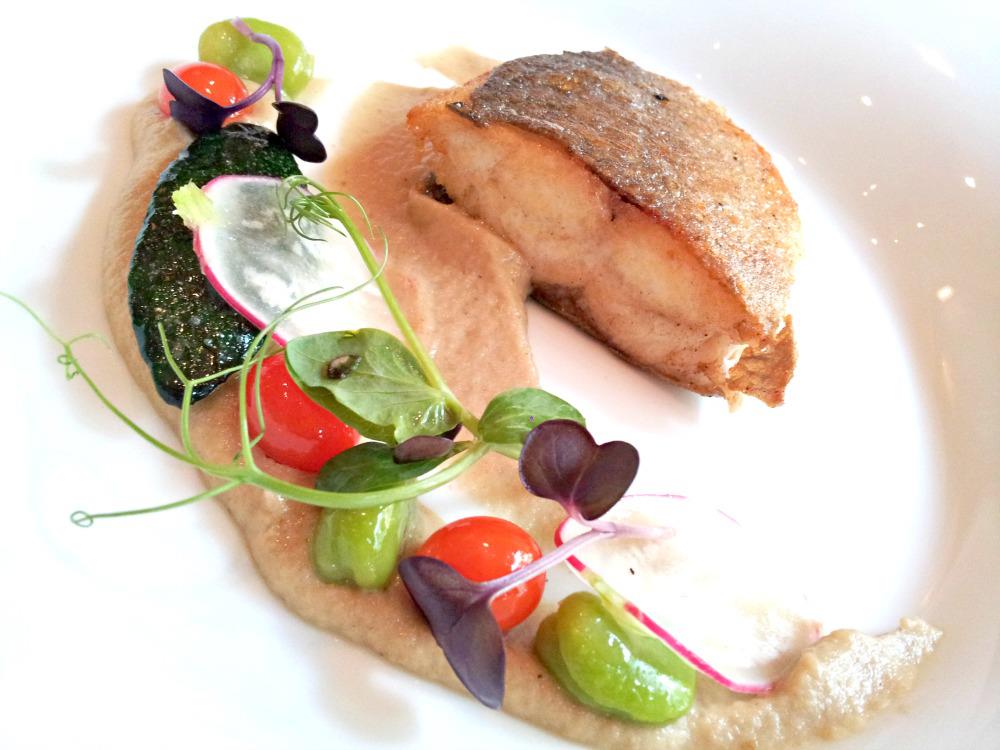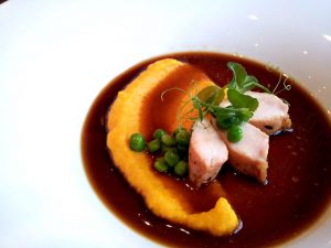 Vítěz ochutnávky byl na jídelníčku spíše nenápadný, ale o to víc potěšující byl ve skutečné podobě a chuti. Králičí hřbet na karotkovém pyré, sotýrovaný hrášek, estragonová šťáva. Sous-vide králík je excelentní, pyré jemné, ale ne přehnaně mrkvové chuti, demi-glace z králičích kostí (mají tu asi 8 druhů silných omáček ke každému jídlu zvlášť, žádný univerzál, vždy z kostí odpovídající pokrmu). Pak tu máme zázrak – rybu bez kostí, ale ne filet, nýbrž uzavřenou podkovu. Pražma královská s kaší z pečeného lilku, fava fazolky, cherry rajčata. Pražma je totiž klasicky vyfiletovaná, ale pak se filety dají zpátky k sobě, zavakuují a pomalým vařením se maso k sobě přicucne zpátky. Následně se jen lehce opeče, aby měla křupavou kůži. Lilkové pyré taky moc dobré. Dál tu máme Hovězí jazyk se silnou šťávou, hrachovým pyré a salátkem z mladých lístků. Ano, další pyré a opět výborné a zas úplně jiné chuti. Jazyk předem marinovaný a pak sous-vide. Následoval dezert z bílé čokolády s malinovým domácím žužu a kávovou omáčkou. Toho mi můj ochutnávací kolega nenechal ani na špičku vidličky, což mluví za vše – já místo sladké tečky totiž měla v merku ještě jednu věc – Mušle svatého Jakuba s omáčkou ze zauzených paprik, okurkovo-celerový salátek. Mé srdce zaplesalo a zároveň můj žaludek začínal být u posledního sousta smutný. Zase se dlouho v nové restauraci totiž nenajím tak skvěle, jako tady… Cena/ provedení absolutně 10/10. Tady jsem stoprocentně nebyla naposledy.