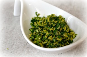 Připravte gremotatu. Ideální jsou samozřejmě biocitrony, kde máme větší právo doufat v absenci chemického ošetření :) Každopádně ho pořádně omyjte. Škrabkou na brambory stáhněte to „žluté“ bez hořkého „bílého“. Rozsekejte na úplnou kašičku. Stejně tak česnek a petrželku. Smíchejte. To je vůně, co?