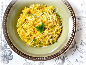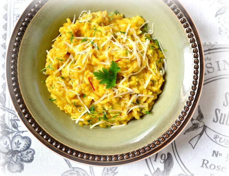 O přípravě risotta se řeklo již mnohé. Na začátek máslo, na něm dosklovata šalotku, pak nevypranou rýži carnaroli, restovat 30-60 vteřin. Bílé víno. Vyvařit. Šafrán klidně dejte před rýží. A nebo po víně. Viděla jsem už obě možnosti. Po víně první 1-2 naběračky podle velikosti, rýže by měla být ponořená akurát tak těsně. Necháme vyvařit. Pálíme to na vyšší plyn, aby vše nepřestalo vařit po přilití. Přiléváme proto ideálně vývar horký. Nesolte ho (nebo ne moc), dosoluje se parmazánem na konci. Vývar přiléváme za těch cca 18 minut vaření tak 5-6x. Risotto se nejlépe dělá v kovovém rendlíku. Ten můj je na to moc mini, takže mám vyšší menší pánev. Na konci spolu s máslem a parmazánem ideálně jen prohazujete. Na mě to byla tíha a měla jsem pocit, že mi to uteče z pánve, takže jsem použila míchací metodu. Tradááá.