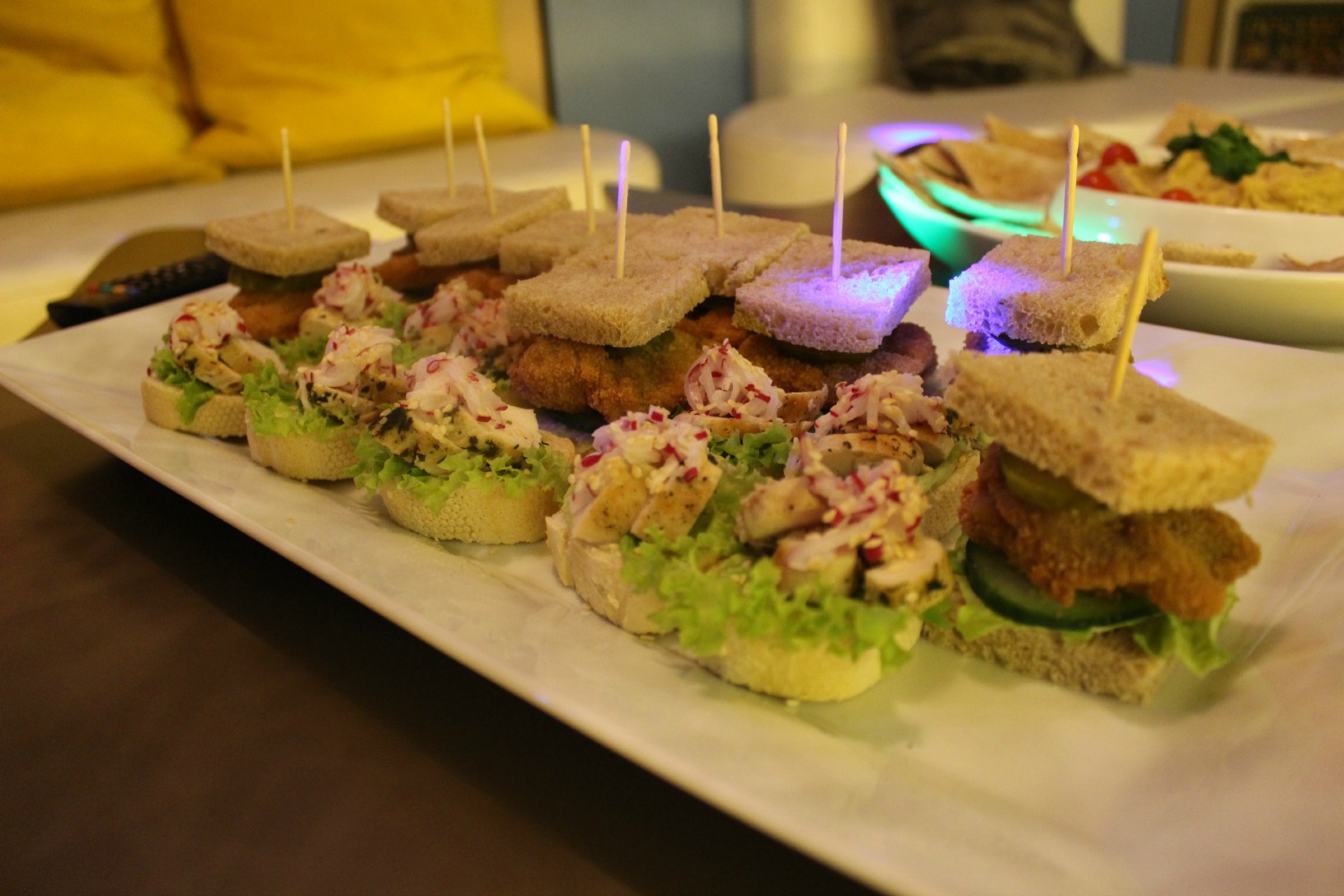 Celkově bych jídlo označila za průměr. Pravda, nejdete sem za nějakým fascinujícím gastrozážitkem, ale hlavně si užít party s kamarády. Jen bych k tomu napsala, že na hlad to deseti lidem stačit nebude, ani to tak nebylo myšleno. Jde o to moct během večera něco zobat. Na základ pro žaludek, aby vám přeci jen zítra nebylo moc špatně po kalbě, doporučuju si zajít před šestou večerní ještě někam jinam. Třeba na Pho na Jiřák, to je od aktuálního umístění Partyhausu kousek. Salsy a omáčky na namáčení byly v pohodě, za domácí výrobu bych ruku krom tuňákového krému do ohně nedala, ale v klidu a bez problému. Nachos nikdy nic nezkazí. O kousek horší to bylo s pečivem, protože jsme měli bagetky dané v lednici, což není dobrý nápad. Poměrně přioschlý byl i arabský chléb k hummusu, crudité i chleba v „miniburgerech“. Zkrátka všechno jídlo bylo připraveno asi až příliš předem a tím trochu utrpělo. Vyloženě příjemným překvapením pro mě byl tatarák z červené řepy, ten byl super. U nás měly úspěch nejvíc tyčinky, tatarák a salsy s nachos. Jak večer postupoval, někdo začal vyžírat samotné řízky z „miniburgerů“ :)