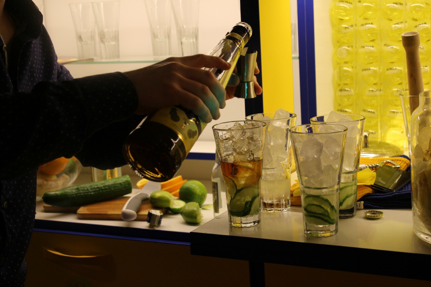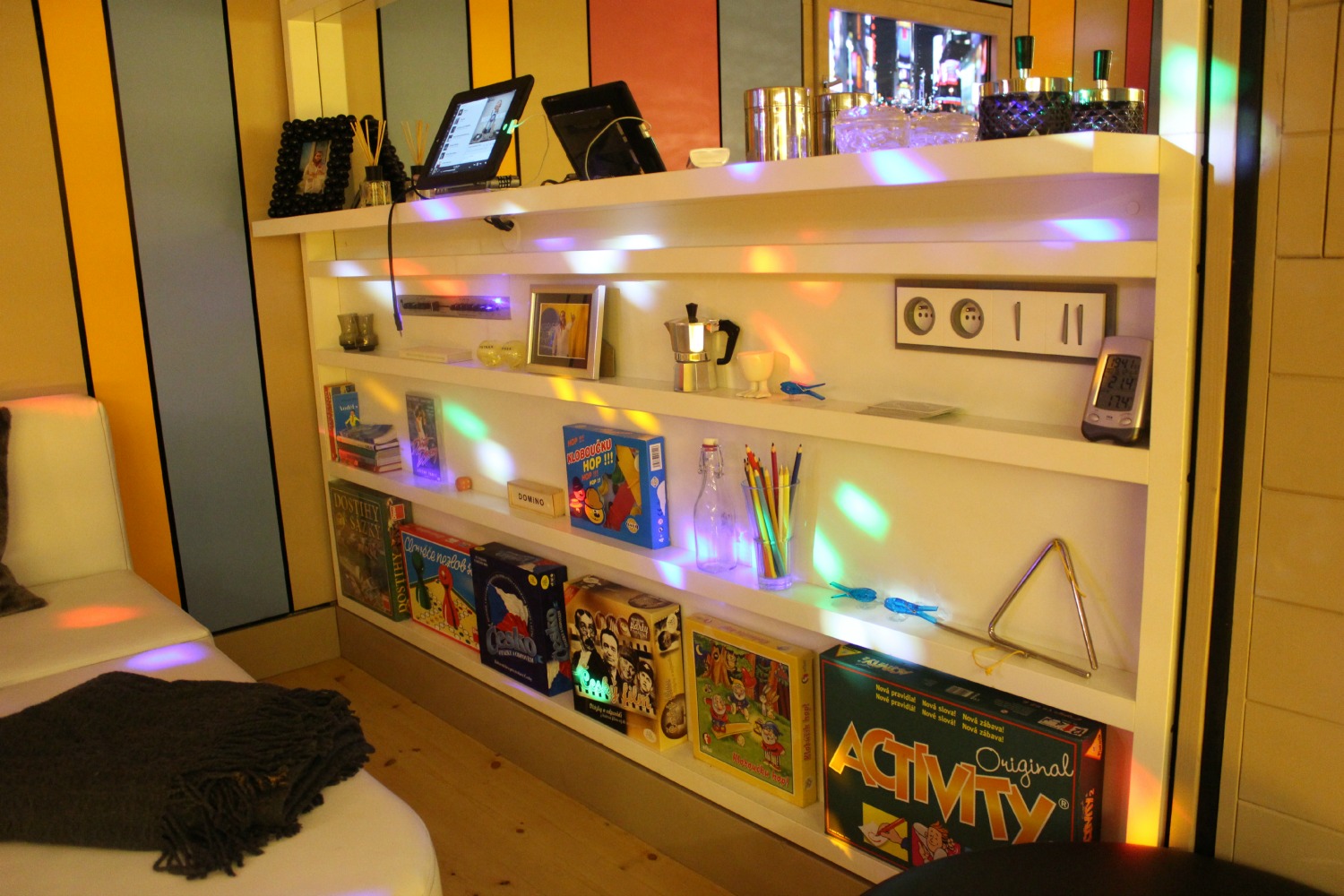 Takže ano, můžete pít jako prokopnutí. A co dál? No, nemusíte pít jen čisté panáky a k tomu z vedlejší sklenice popíjet nealko. K dispozici je knížtička s postupy různých koktejlů, všechny ingredience jsou v Partyhausu k dispozici ( i když co tam není, to tam není ) a pokud vám čtení moc nehraje s představivostí, můžete využít i videa nahraná v chytré televizi. Pak už to namíchá každý. K tomu si můžete zahrát taky stolní hry. Pouštět hafo muziky a nebo si připojit svůj muzikální zdroj a sosat ho pomocí kabelu. A to vše za svitu barevných prasátek pohybujících se po zdi.