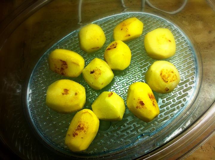Nakrájejte cibulku nadrobno, na másle dozlatova orestujte a přendejte do menšího pekáčku. Tam vložte i orestovaná kuřecí stehna ze stejné pánve, kde jste restovali cibulku. Osolte, opepřete, přidejte kmín. K tomu přilijte vývar. Dejte péct do trouby na 60 minut na 160 stupňů. Budou tak odpadat od kosti, ale neztratí šťavnatost. Na posledních pár minut je pak můžete dát na gril. Oloupejte malé brambůrky a na pánvi ještě po kuřeti syrové asi 5 minut restujte. Přemístěte je 40 minut před podáváním do nejnižšího patra parního hrnce. Osolte, opepřete. Chřestu odlámejte poslední třetinu délky. Zdřevnatělé konce můžete vyuřít např. na polévku a nebo vyhoďte. Slupku z konců můžete ještě oloupat škrabkou na brambory. Vložte do vyššího patra parního hrnce 8 minut před koncem vypršení doby pro brambory.