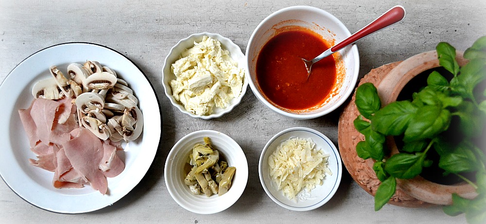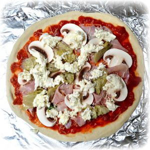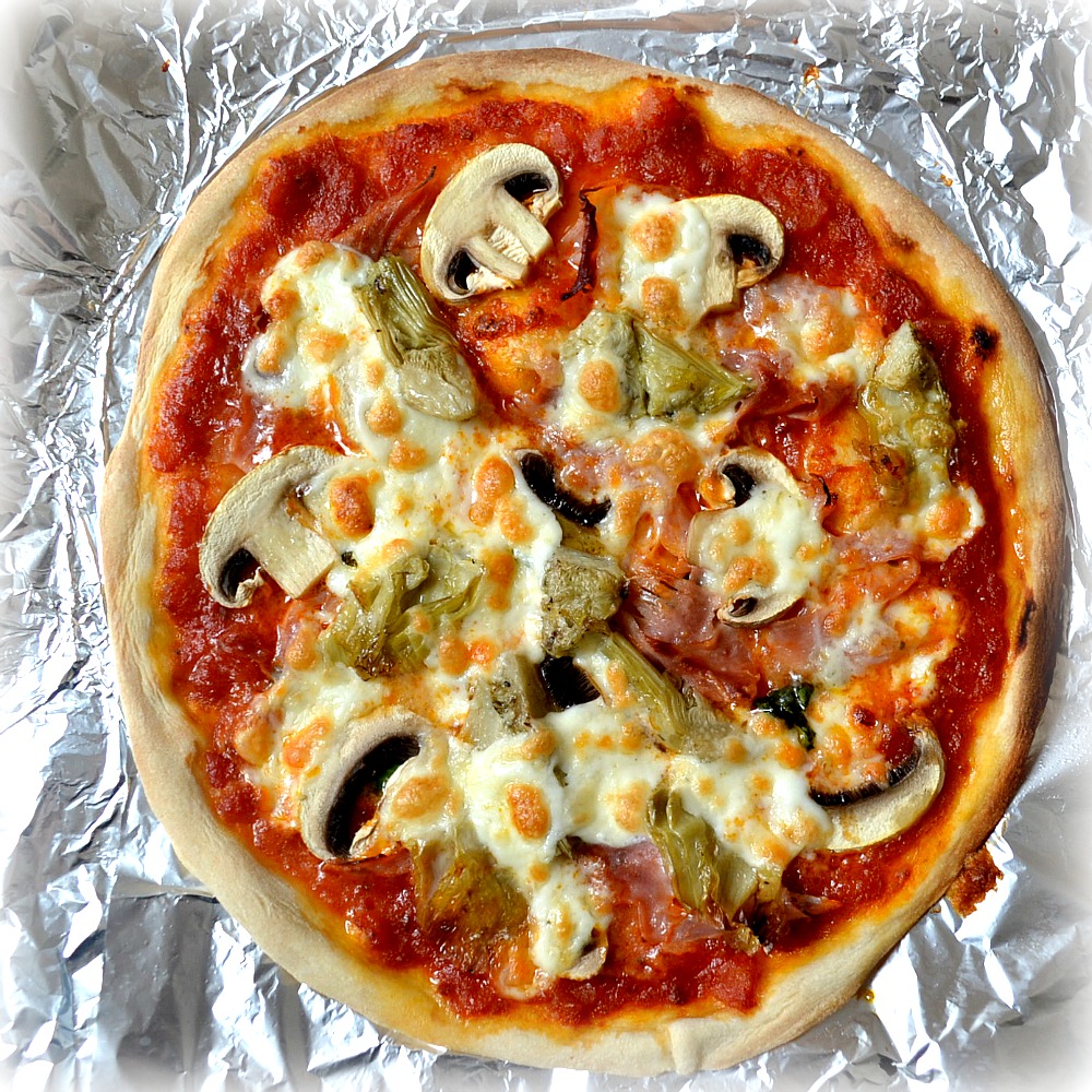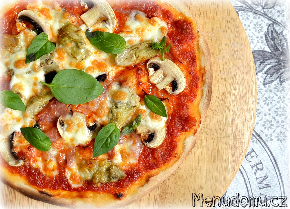 Pak už stačí jen nakouskovat další ingredience na pizzu. Nutno říci, že podle originální italské pizzařské teorie patří na jednu pizzu 4 ingredience – sugo, mozarella a ty další dvě jsou na vás. Co se mozarelly týče, chápu, že to svádí, koupit tu za 16 místo za 27 Kč, ale v chuti je rozdíl dost znát. Ta za 16 nemá chuť vůbec žádnou, takže pokud už to má být pizza se vším všudy co nejvíc skoro italská, tak doporučuju radši třeba Galbani, která sama o sobě i chuť má. S touhle capricciosou jsme trochu nad rámec, co se počtu ingredienček týče, ale ta kombinace je vážně výborná. Je to na vás, našvíkejte si tam, co hrdlo ráčí :) V našem případě tedy ještě