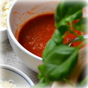 Ve videu jsem chtěla co nejvěrněji napodobit složení ze vzorové pizzerie Pizza Nuova (jejich popis: rajčata San Marzano, sýr Grana Padano, žampiony, šunka od kosti, artyčoky, sýr fior di latte /= mozarella z kravského mléka,pozn. Koko/, bazalka), takže jsem použila jediná nakládaná rajčata San Marzano, která jsem sehnala, tedy celá – passata nebyla…ale pyré si lze jednoduše vyrobit pomocí mixéru. Na oleji česnek na drobno necháme minutu rozvonět, pak ztlumíme teplotu a přidáme rajčata. Necháme asi o třetinu zredukovat, dochutíme solí, cukrem, popřípadě dalším kořením. Necháme zchladnout.