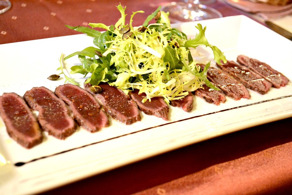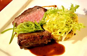 Carpacciem ze srnčího hřbetu, marinovaným v lanýžovém oleji a růžovém pepři, s frisée salátkem, rukolou a praženými dýňovými semínky se zde snaží všechny přesvědčit, že ani na nepropečené zvěřině není nic špatného, ba naopak její delikátnost se v tomto stavu může naplno projevit a připravit dokonalý gurmánský zážitek. Tento předkrm má jemnou chuť a dává tak prostor na vychutnání si tohoto česrtvého sezonního masa. Radím, nebojte se toho a zkuste. Nejen hovězí carpaccio je lahůdka. Zvěřina je velmi kvalitní, hřbet byl z mladého kusu.Hovězímu ´Flank´ steaku s omáčkou ze zeleného pepře a vynikající bábovičkou z gratinovaných brambor ve smetaně s Gorgonzolou nebylo co vytknout, k tomu lehce restované císařské lusky byly výtečnou náhradou klasických zelených fazolek. Maso je australské, skvělé chuti, měkké, šťavnaté. Bramborového gratinu jsem se nechtěla vzdát do posledního kousku a dal by se konzumovat vlastně samotný.