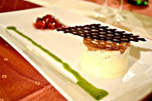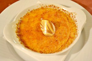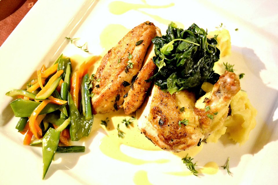 Šťavnaté kuřecí prsíčko supreme, tedy z tzv. kukuřičného kuřátka, marinované v tymiánu a citronové kůře podávané s dokonalou smetanovou omáčkou a bramborovou kaší ochucenou pečeným česnekem a k tomu všemu máslově jemná orestovaná čerstvá křupavá zelenina a čerstvý, lehce podušený listový špenát. Všechno skvělé, hrálo to dohromady. Kuře bylo na vteřinu přesně udělané tak, aby nezůstal střed ani na milimetru růžový, ale aby prso zůstalo šťavnaté, jak jen to jde. Ale kůžička křupavá. Prostě dokonale zpracovaná surovina. Čokoládový mousse v překvapivě dobrém zpracování z tmavé a bílé čokolády, příjemné panna-cottové konzistence, se sladce caramelizovanými višněmi a aromatickou omáčkou z čerstvé máty se jen rozplývá na jazyku. Boží. Božské. A k vanilkovému Créme Brulée lze dodat jen jediné, zapomeňte na všechny ty pudinky s cukrovou krustou a jiné pokusy leckterých českých restaurací, pravé Créme Brulée prostě nelze nahradit a tady to dobře vědí.