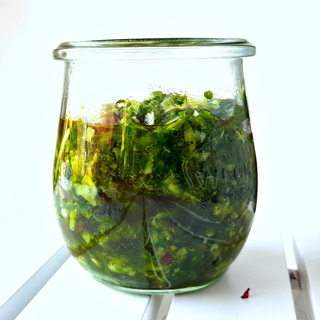 - velká hrst pokrájené zeleně (bazalka, rukola, medvědí česnek nebo kombinace)