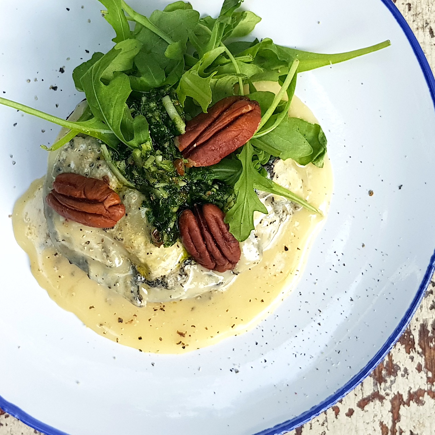 Servírujte s trochou rukoly a ozdobte oříškem.