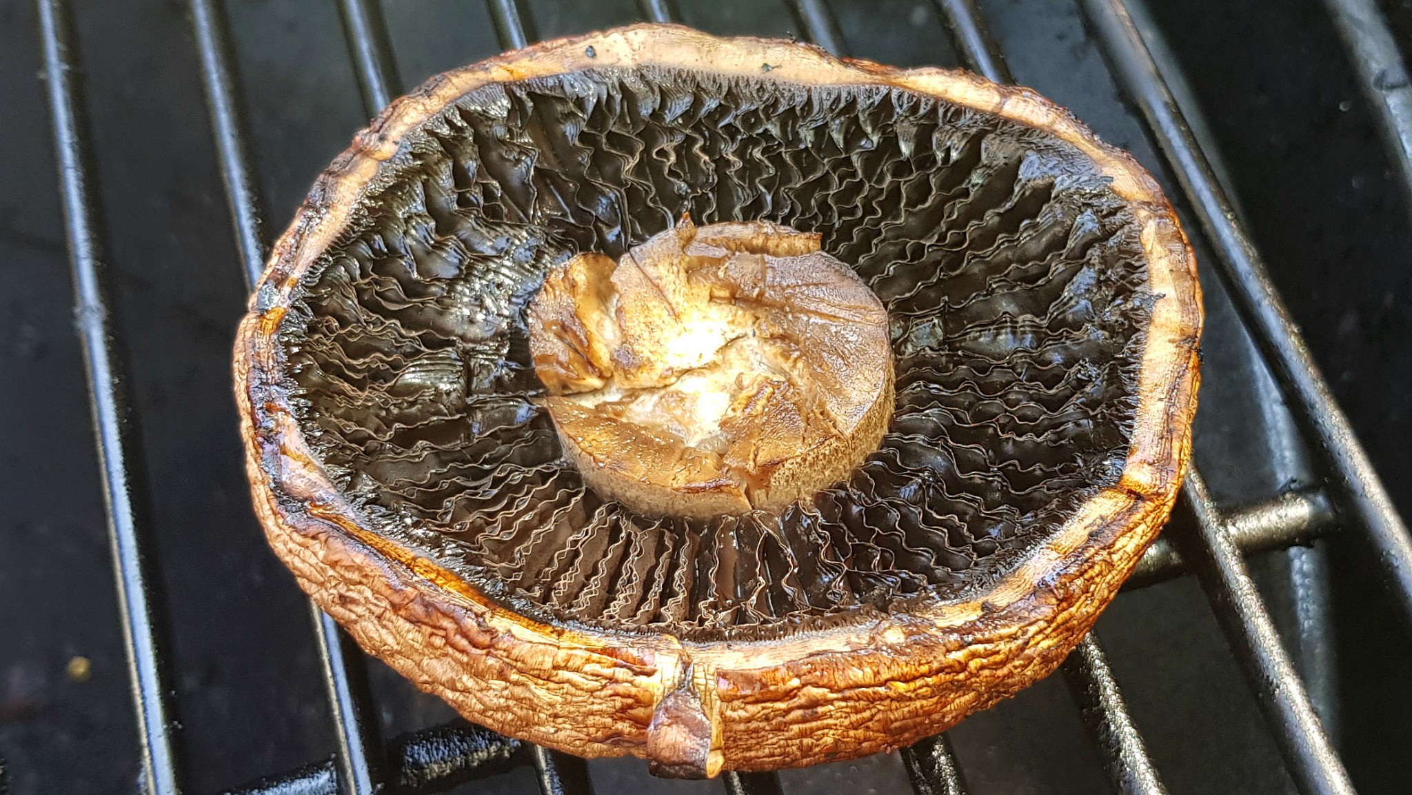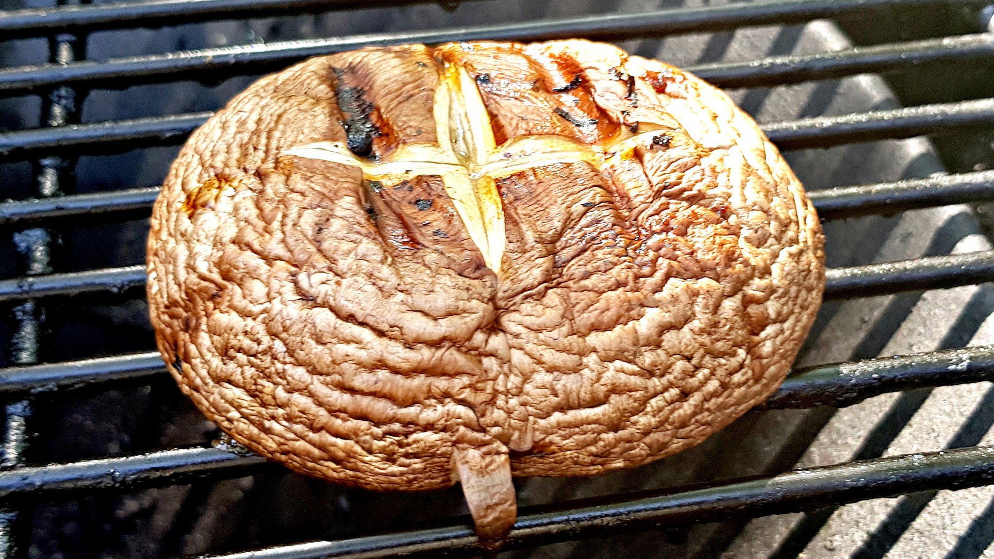 Portobello se chová jako každý žampion na grilu – smrskne se i skoro na polovinu své původní velikosti. Proto se nebojte pořizovat klobouky jak deštníky. Musejí být nicméně stále pěkně pevné a čerstvé. Mám většinou ve zvyku je na vypouklé straně do kříže naříznout, aby teplo prostupovalo skrz o něco lépe. A nebo je nožem na třech místech probodnout. Tyto dírky fungují jako kanálky na vodu, která z nich může jednodušeji odcházet. Klobouky můžete potřít zlehka olivovým olejem. Solit a pepřit až po ugrilování. Na začátku by z nich všechno odpadalo. Takhle vzrostlá houba potřebuje grilovat na poměrně silném žáru tak 10 minut z každé strany, aby uvnitř nebyla syrová a příliš nekřupala. K tomu se na ní stihne vytvořit i příjemná krusta.