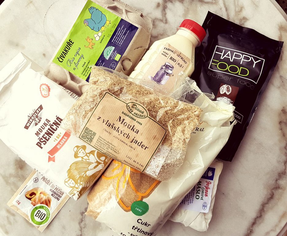 Ingredience na tento recept jsem pořídila ve Sklizeno včetně bio kypřicího prášku a kakaa, višňové čokolády, mletých vlašských ořechů i vajíček z farmy.