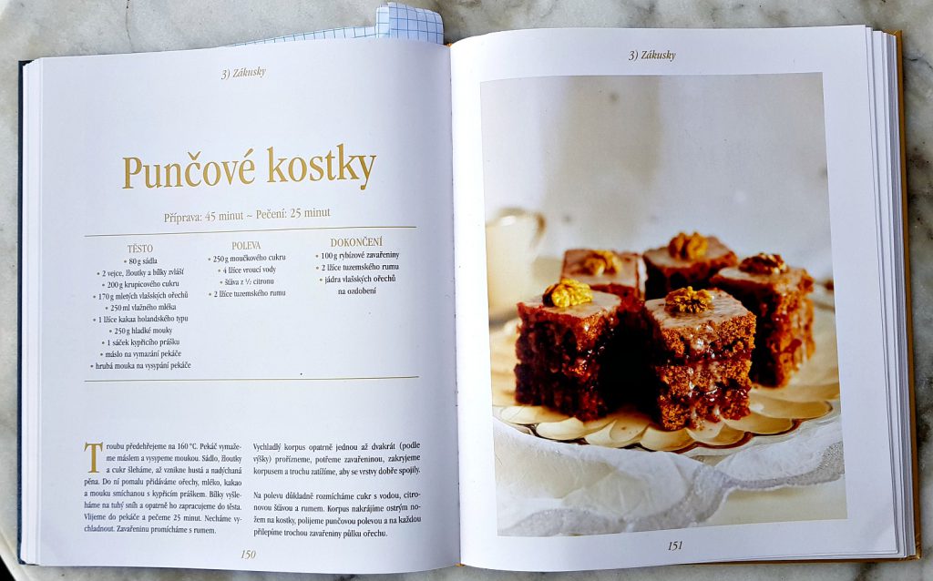 Sladkých kuchařek na trhu sice není nedostatek, ale moje oči ulpěly na téhle. Po bližším ohledání jsem usoudila, že repertoár receptů je dostatečně zajímavý, popisky i pro dezertního nýmanda mého ražení celkem srozumitelné, fotografie atraktivní tedy motivující k výkonu a receptury dostatečně tradiční, prvorepublikové. Mimochodem i cena 399 Kč přijatelná. Vzhledem k letošní úrodě vlašských ořechů (a v létě i ovoce k výrobě zavařenin) plus přívětivé délce postupu přípravy jsem napoprvé zvolila Punčové kostky. I když, jak vidíte, už tam mám připraveno dost dalších záložek.