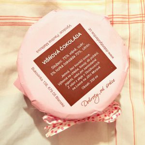 V tuto chvíli ještě není úplně vyhráno, ale bude to už takové zábavnější a méně špinavé. Na to, abyste korpus rozřízli, bude potřeba rovný tenký ostrý nůž. Dlouho jsem nevěděla, na co ho ve své sadě od Ježíška mám, ale teď se hodí jako nikdy. Pokud to výška buchty dovolí, rozdělte ho na tři stejně vysoké pláty. Teď zavařenina. Volte kyselejší, ať výsledek chutná kontrastně. Třeba lesní směs nebo červený rybíz. Já jsem ve Sklizenu kápla na tzv. višňovou čokoládu, která se mi tomuhle účelu víc než zalíbila. Jedná se o zavařeninu z ovoce s přídavkem citronové šťávy, cukru a taky pěti procent hořké čokolády. Chutná to parádně. Na každé patro buchty jsem spotřebovala asi 100 g, tedy třetinu sklenice. Poslední třetinka mi tedy zůstala na příště.