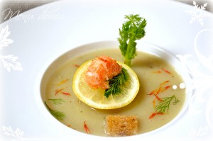 Připravíme fenykl. Horní vrstvu je často nutno odstranit. Odkrojíme také tvrdý a hořký řapík, zbytek nakrájíme na nudličky. Vedle si na pánvičce na troše másla osmahneme pokrájený fenykl. Až se objeví na okrajích zlatavá barva, přidáme šalotku a po 3 minutách taky česnek na tenounké plátky. Hned přidáváme také mouku a za stálého míchání ji minutku zarestujeme. Vše přemístíme do vývaru a přivedeme k varu. Provaříme 15 minut, rozmixujeme ponorným mixérem a ještě propasírujeme přes sítko. Přidáme asi 10 semínek sušeného fenyklu, dosolíme, dopepříme, vypneme plotýnku, necháme v polévce rozpustit trochu másla (už nesmí vařit). Na pánvičce v troše másla ještě lehce omatláme račí ocásky (pokud vám to půjde, odstraňte z nich střívko jako z krevety) a ze dvou kostiček chleba uděláme minitopinky.