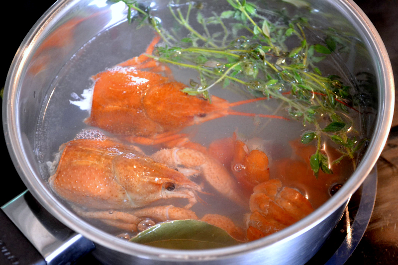 Pakliže jste zakoupili raky čerstvé, místo 4,5 dcl čisté vody použijeme tu vodu, ve které jsme je před tím vařili. Pak tahem oddělíme zadeček od hlavohrudi a z vej pomocí malých nůžek a příčným prostříhnutím článků krunýře vyjmeme maso – ocásky. Uchováme je. Pokud mají ráčci velká klepýtka, vyjmeme maso i z nich. Zbytky vložíme do vody s vínem, přidáme bobkový list, kuličky pepře, trochu soli a tymián a přivedeme k varu. Vaříme tak hodinku na mírném ohni. Slijeme a ponecháme si jen čistý vývar.
